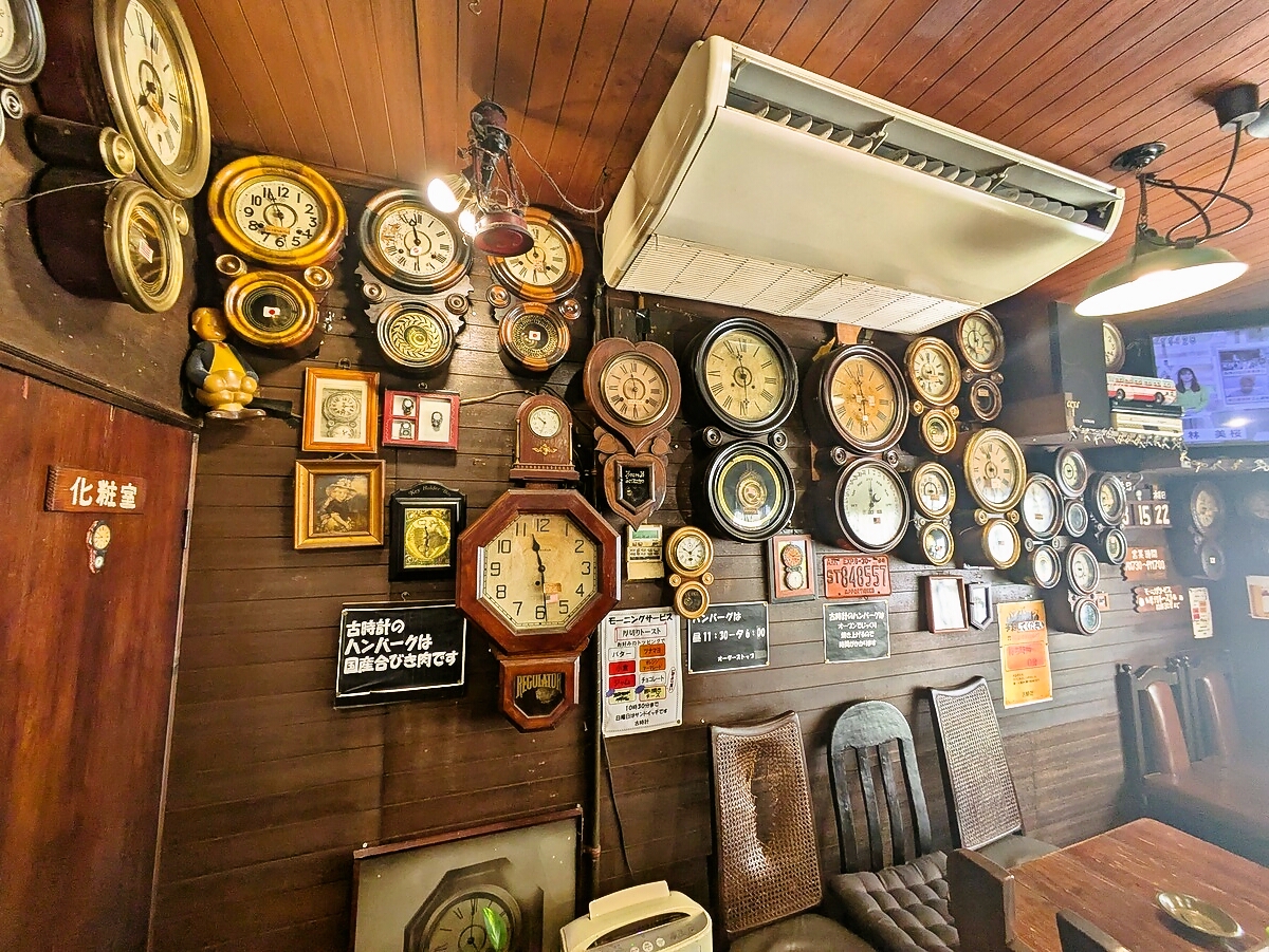 店内は木製の内装と時計の音色が心地よく、まるでタイムスリップしたような空間で食事が楽しめる