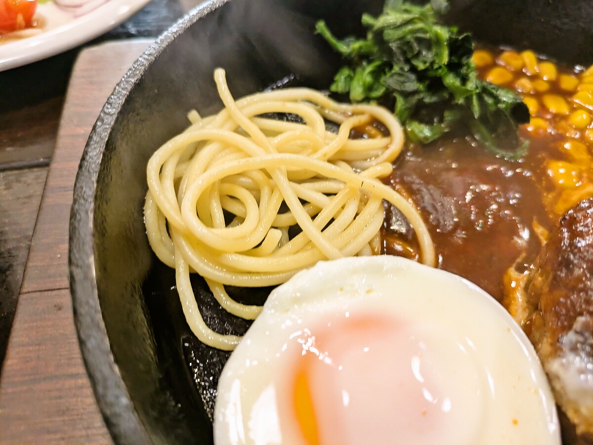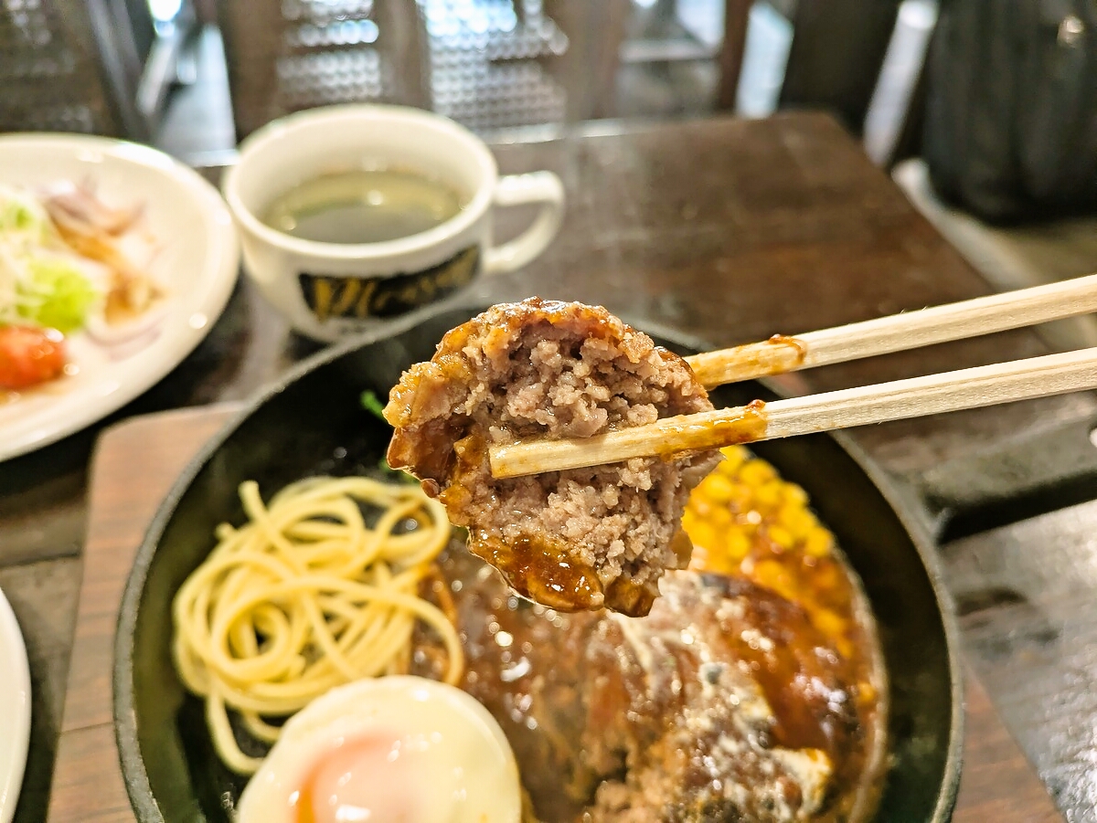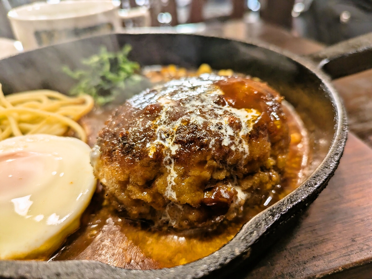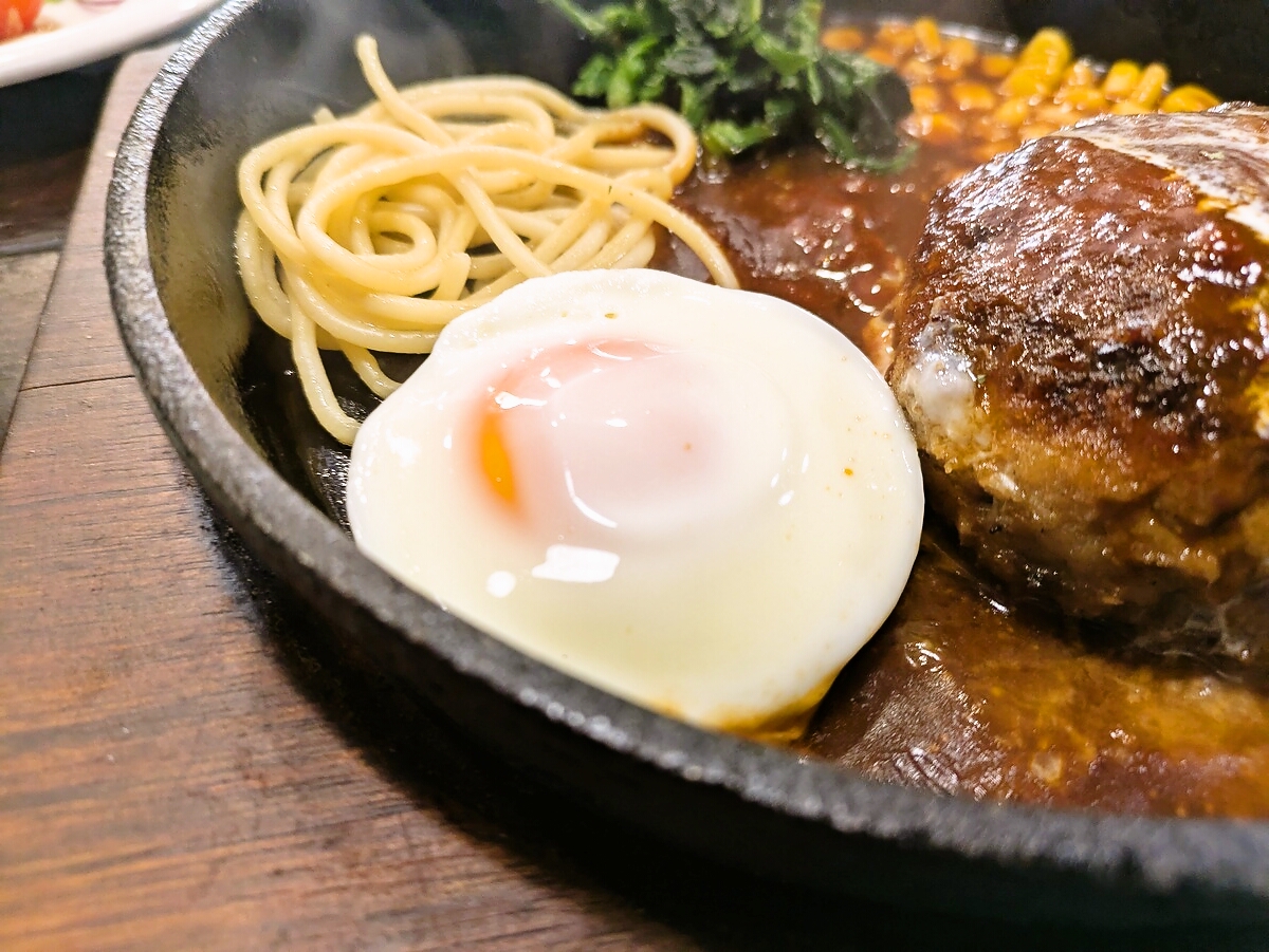 ハンバーグの横には半熟の目玉焼きがトッピングされ、黄身を崩すとソースと混ざってまろやかな味わいに