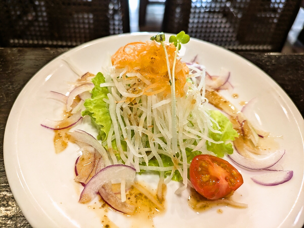 サラダは新鮮な大根、レタス、玉ねぎ、ミニトマトがミックスされ、さっぱりとしたドレッシングで口直しにぴったり