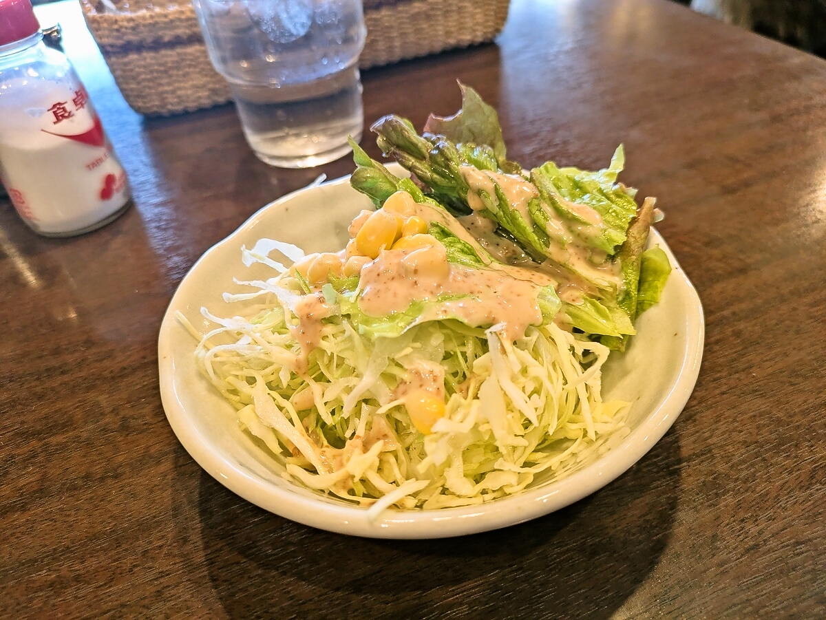 セットのサラダは、シャキシャキ新鮮な野菜にシンプルなドレッシングがかかっている