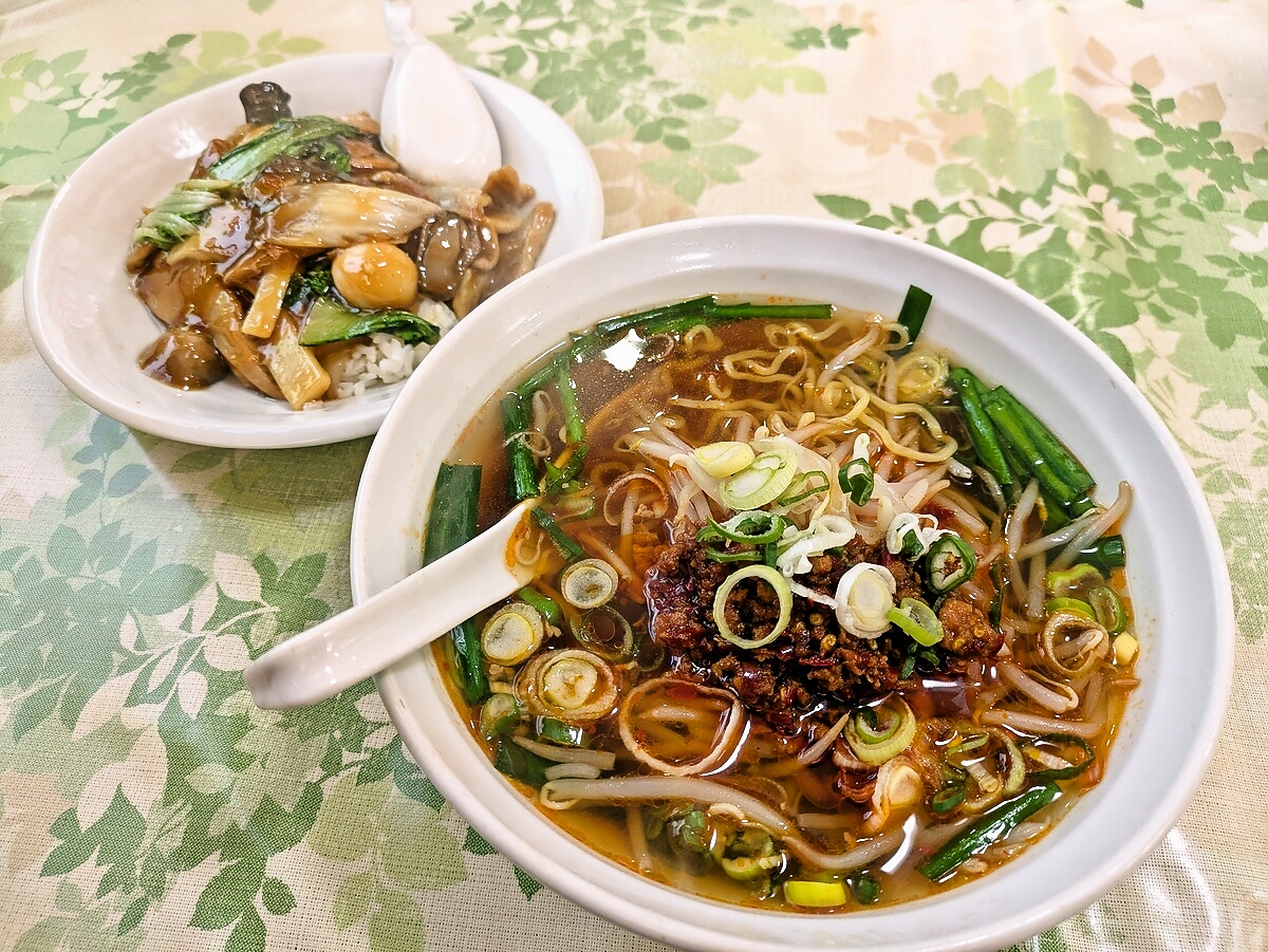 台湾ラーメンの辛さを、中華飯の優しい餡の甘みが中和してくれる最高のペアリングだ