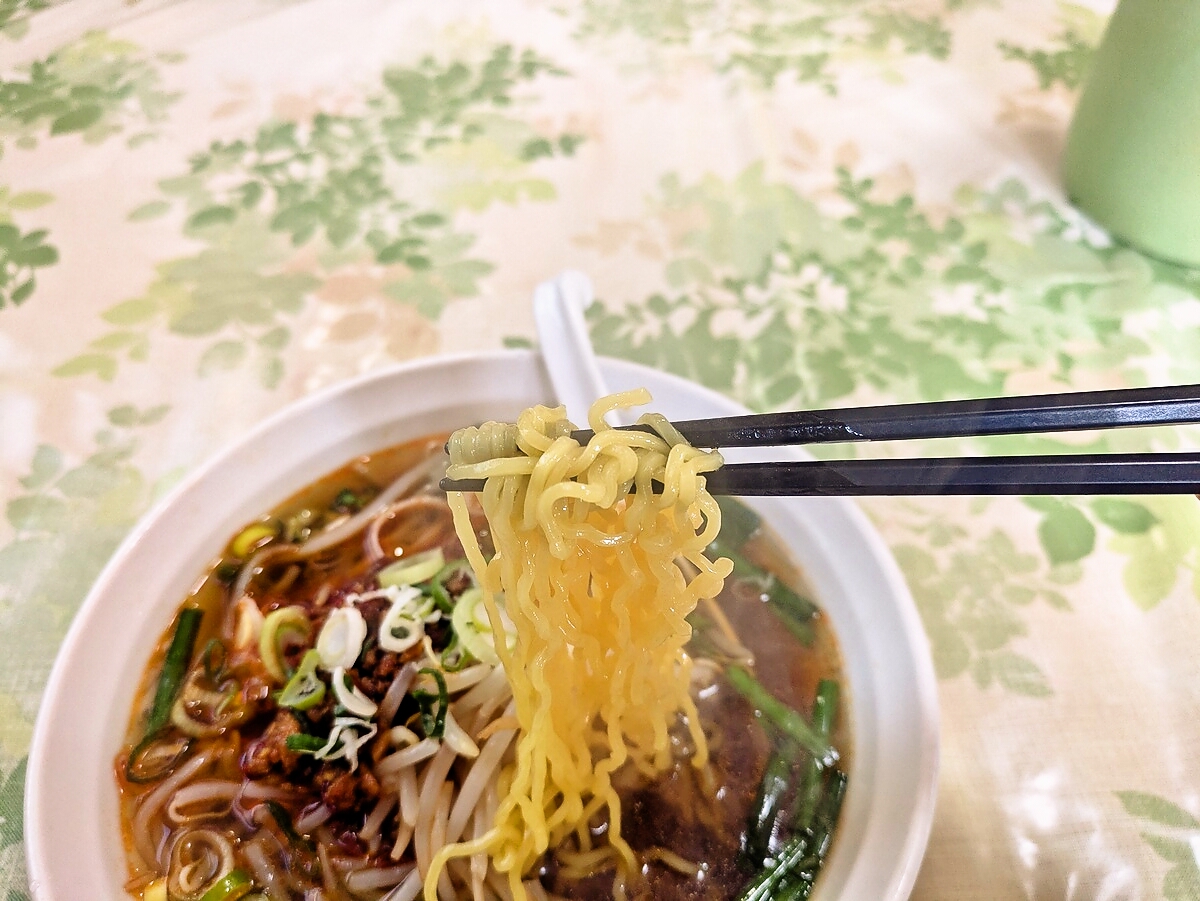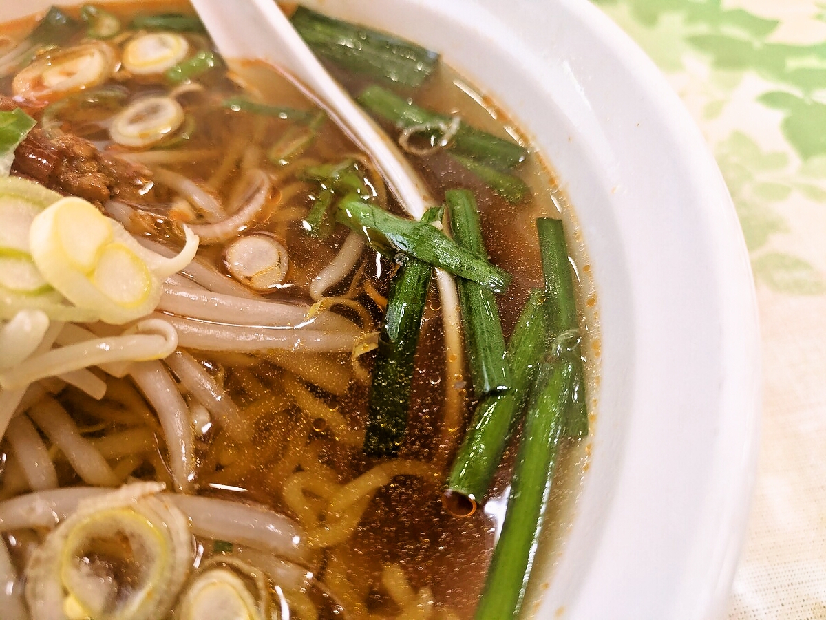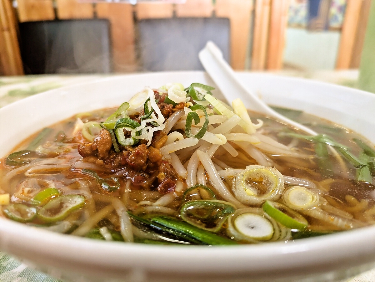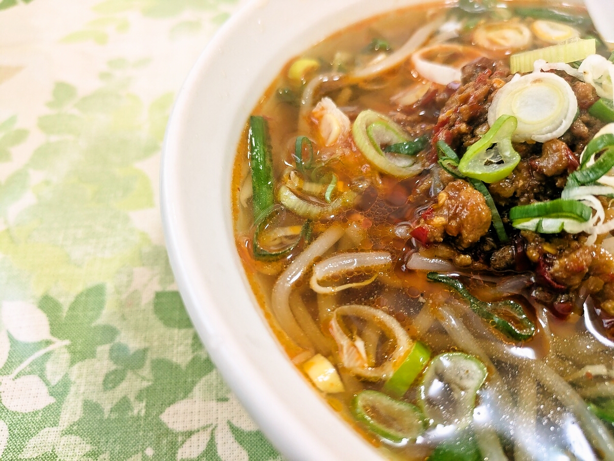 ミンチの旨味がスープに溶け出し、ニラやもやしの野菜が食感をプラス