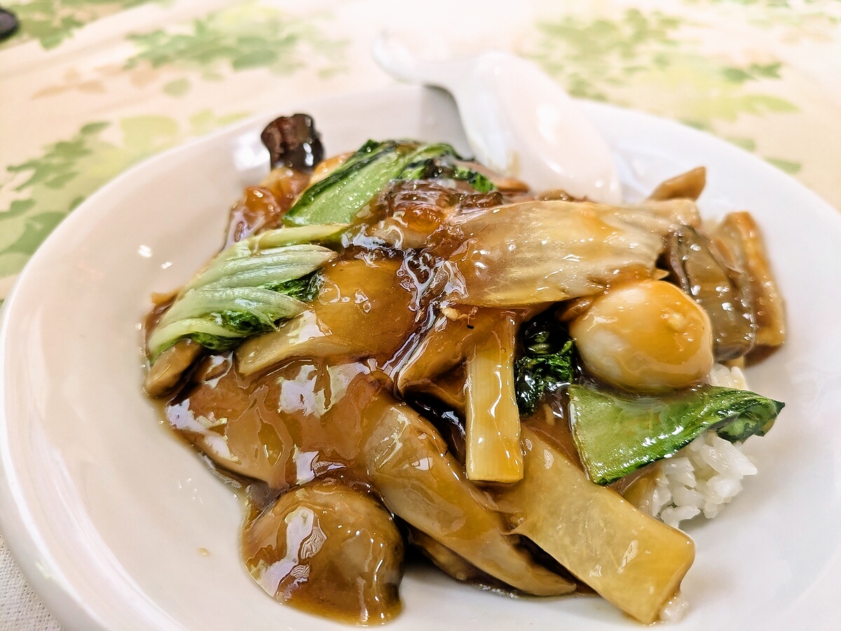 熱々の餡がご飯にかかり、豚肉、野菜、海鮮などの具材がたっぷり