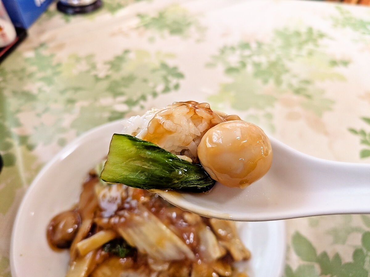 餡のトロミがご飯に染み込み、甘辛い味付けが食欲をそそる