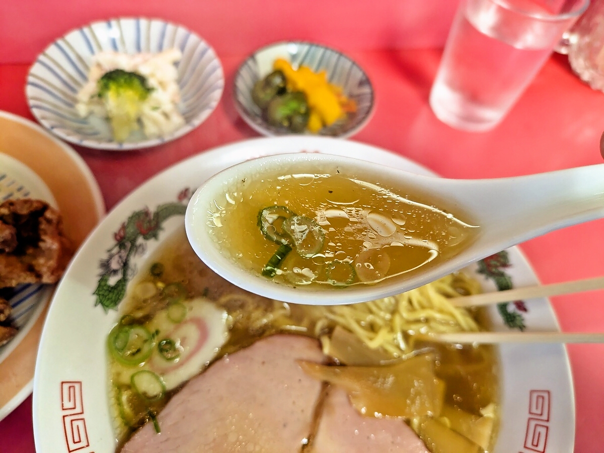 クラシックな中華そばのスープは鶏ガラベースのあっさり系で、胡椒のピリッとしたアクセントが効いている