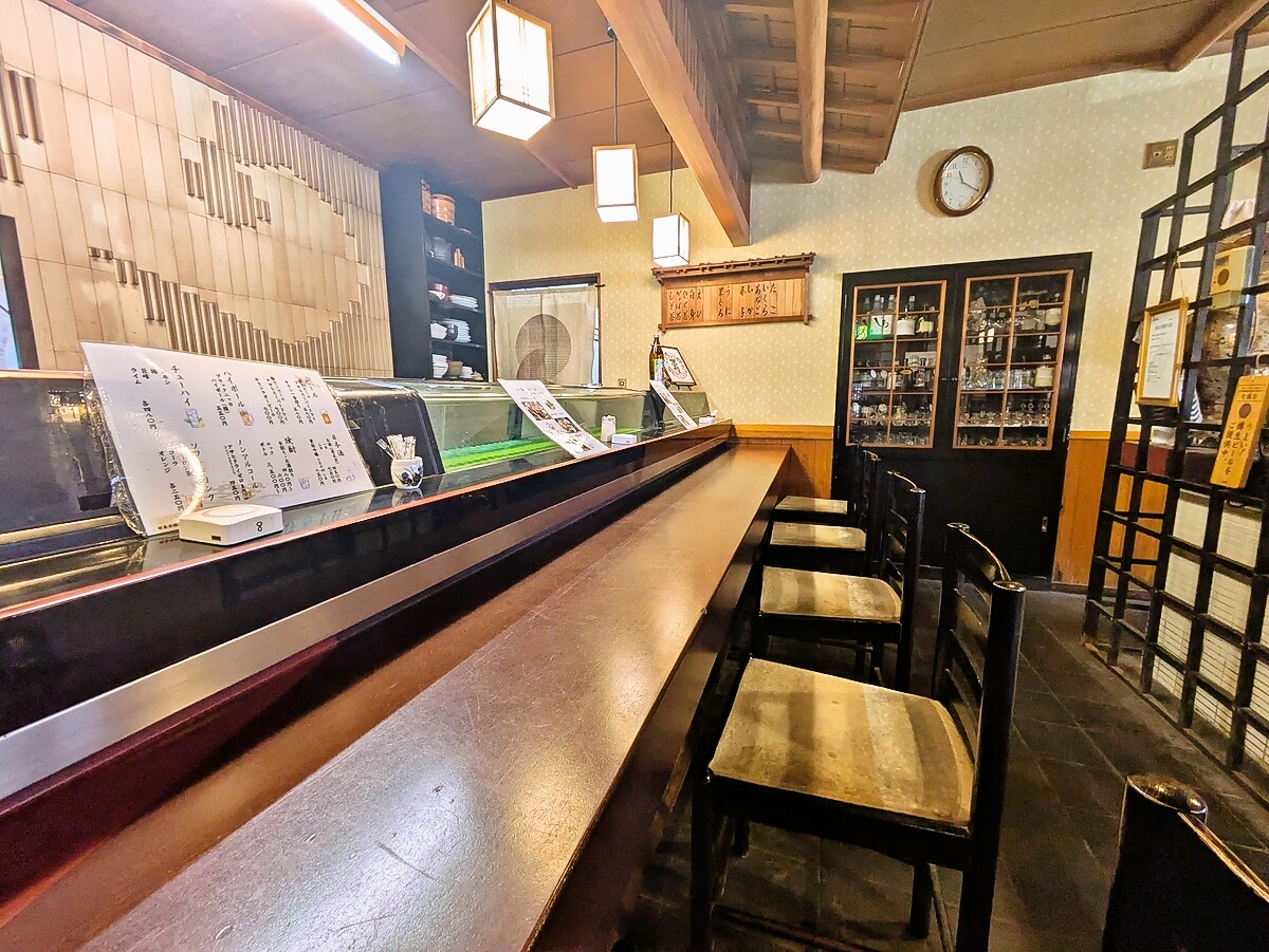 店内は落ち着いた和の雰囲気で、中央に生け簀があり、カウンター席や座敷席がゆったり配置されている