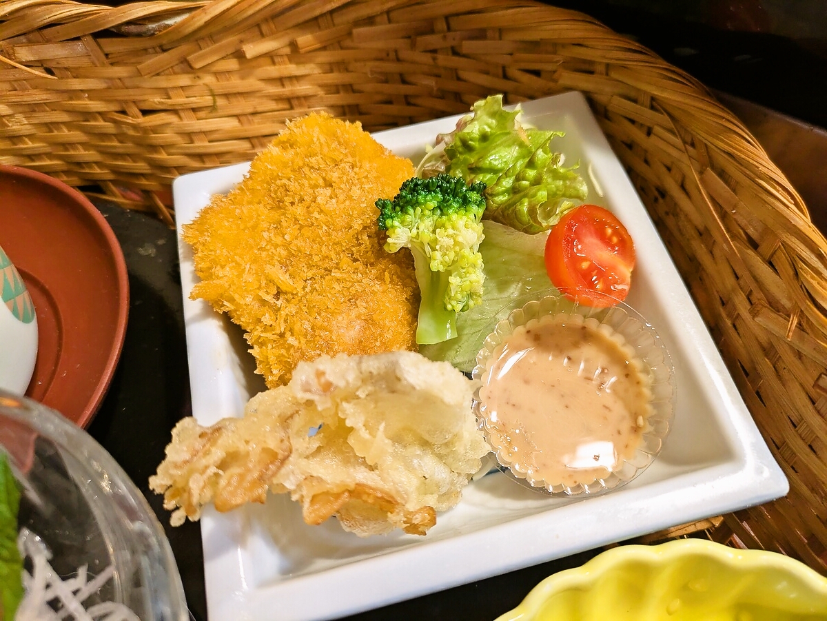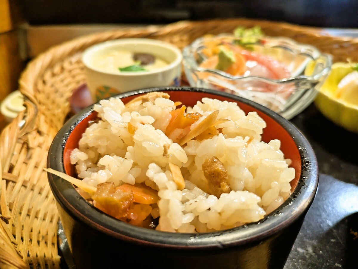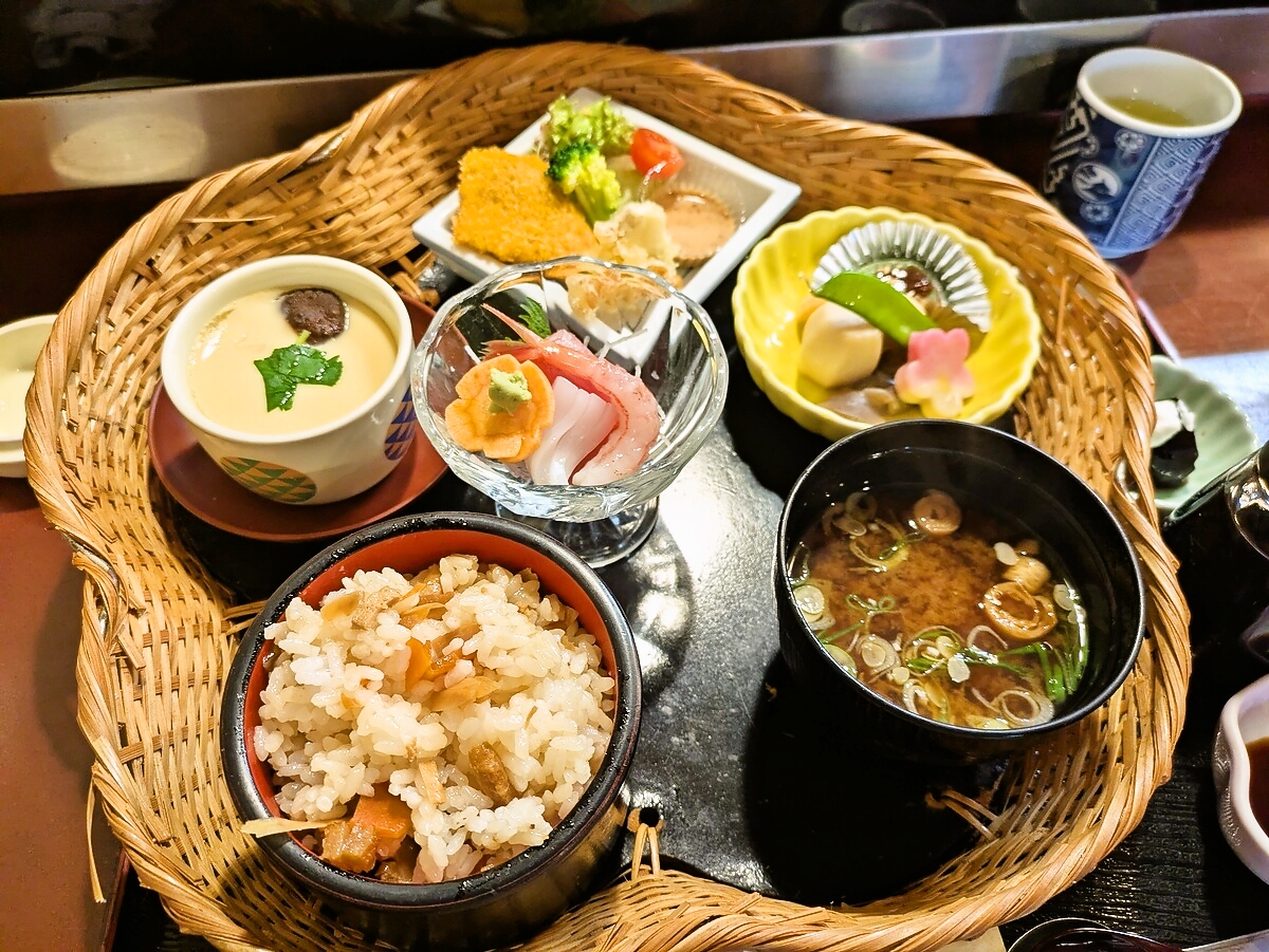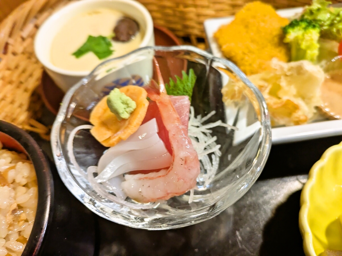 刺身・揚げ物・煮物とバランスよく揃い、五目ごはんで満足感もしっかり