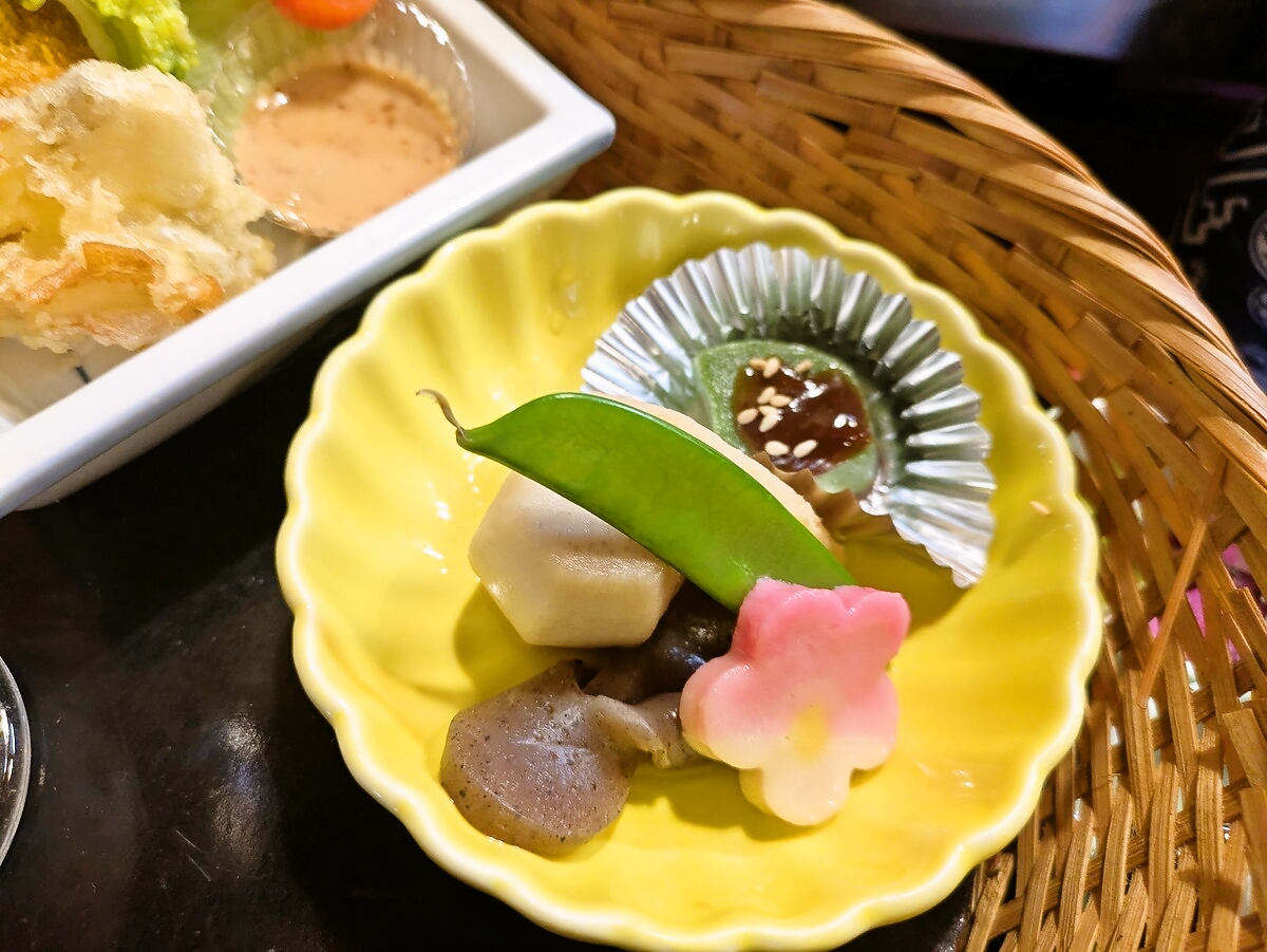 里芋の煮物がメインで、コンニャクや野菜が一緒に煮込まれた優しい味わい