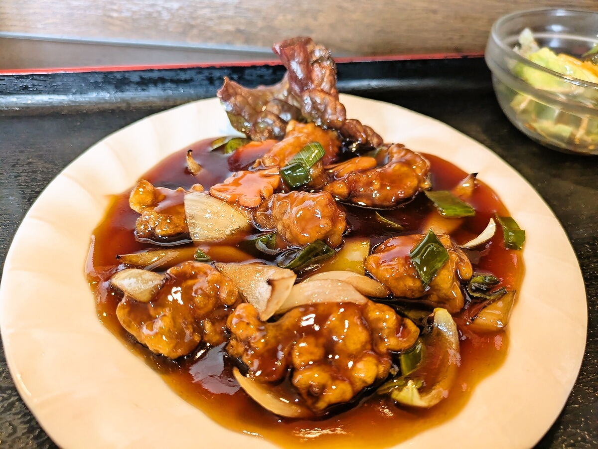 広東風酢豚は豚肉の塊がゴロゴロと入った一品で、衣はサクサク、中は柔らかくジューシー