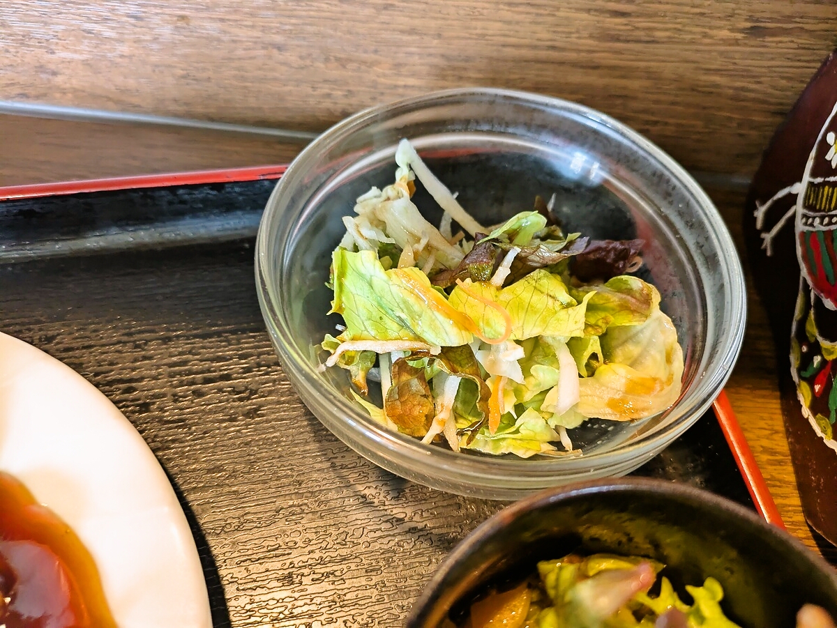 サラダは新鮮なレタスやキャベツをベースにしたシンプルなもの
