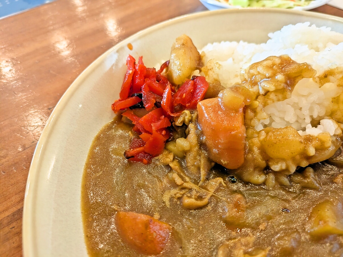 カレーソースはスパイスの効いた中辛タイプで、野菜の甘みと豚バラのジューシーさが溶け合い、食べ応え抜群