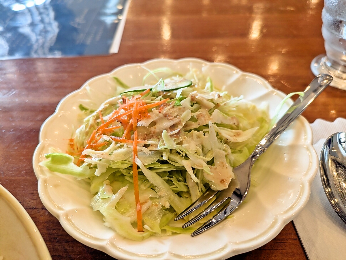 付け合わせのサラダは新鮮なレタスやキャベツをベースに、シンプルなドレッシングでさっぱり
