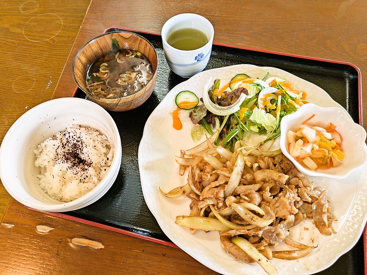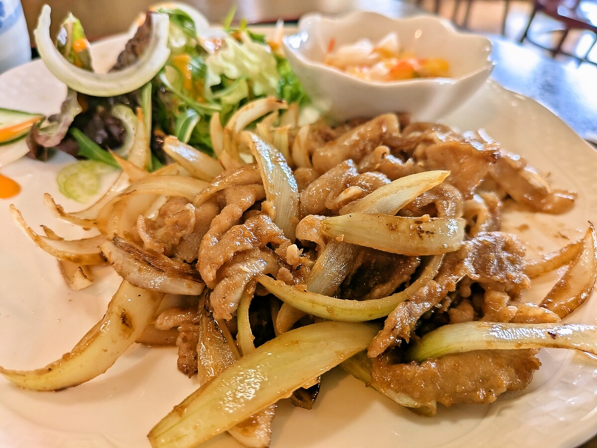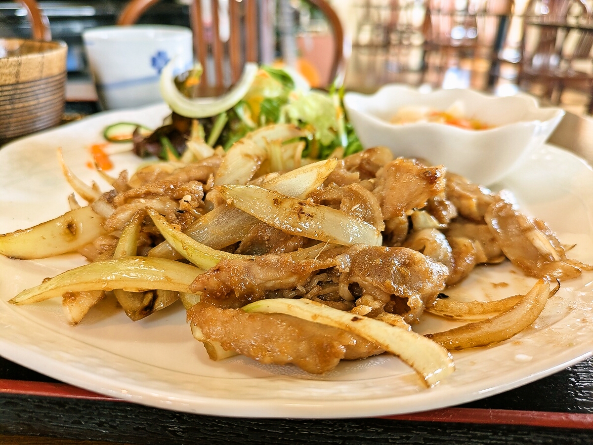 大きめのワンプレートに盛られたしょうが焼きは、薄切りの豚肉が玉ねぎと一緒にこんがりと炒められ、照りのあるタレが食欲を刺激する