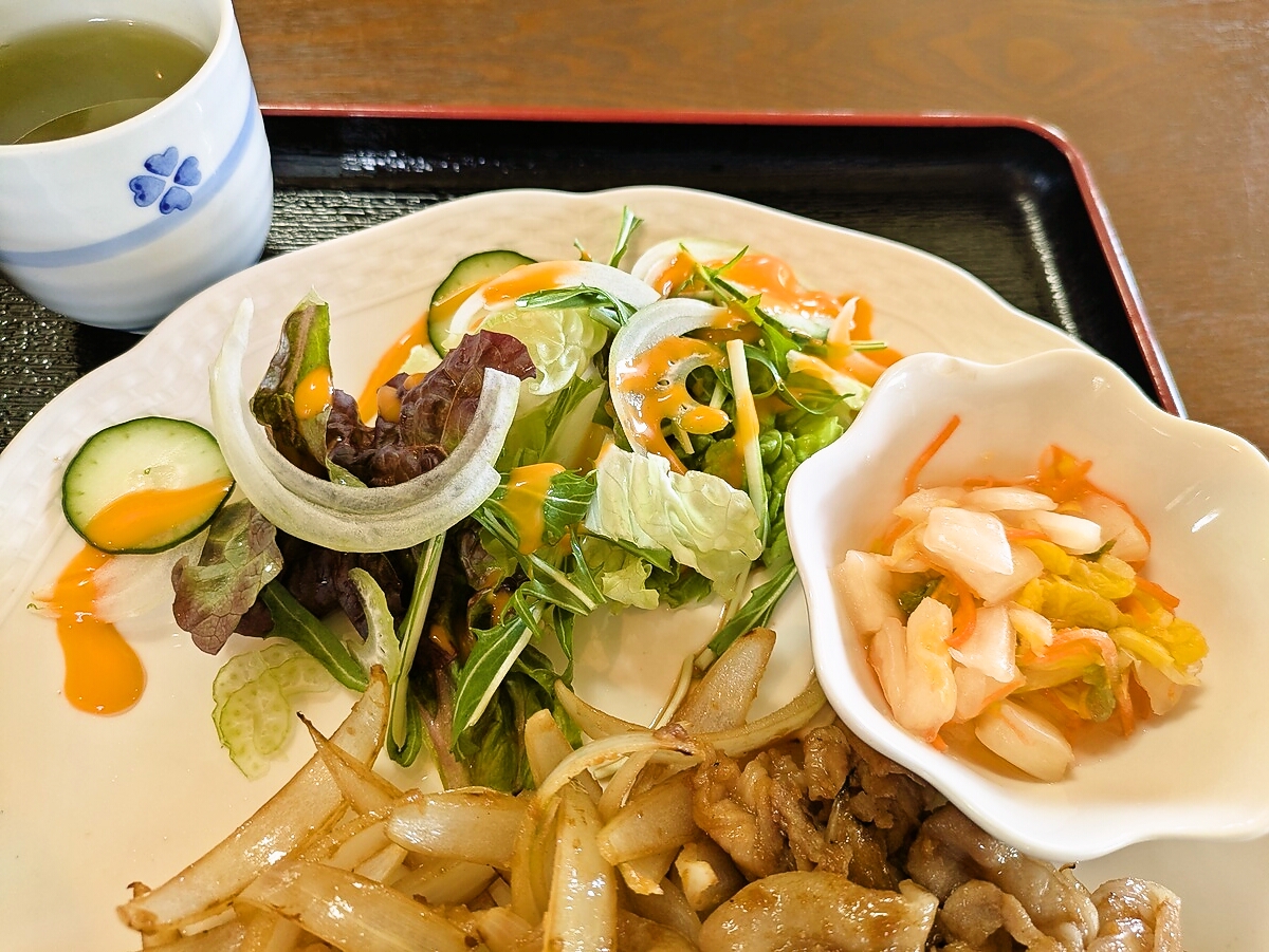 サラダは新鮮なレタス・水菜・きゅうりなどが彩りよく添えられ、さっぱりとしたドレッシングがアクセント