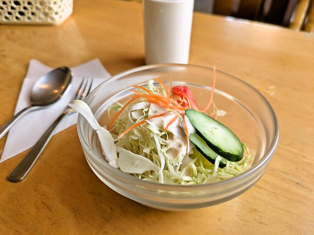 ミニサラダはさっぱりとしたドレッシングで、温かいピラフとの相性も良く、ちょうどよい箸休め