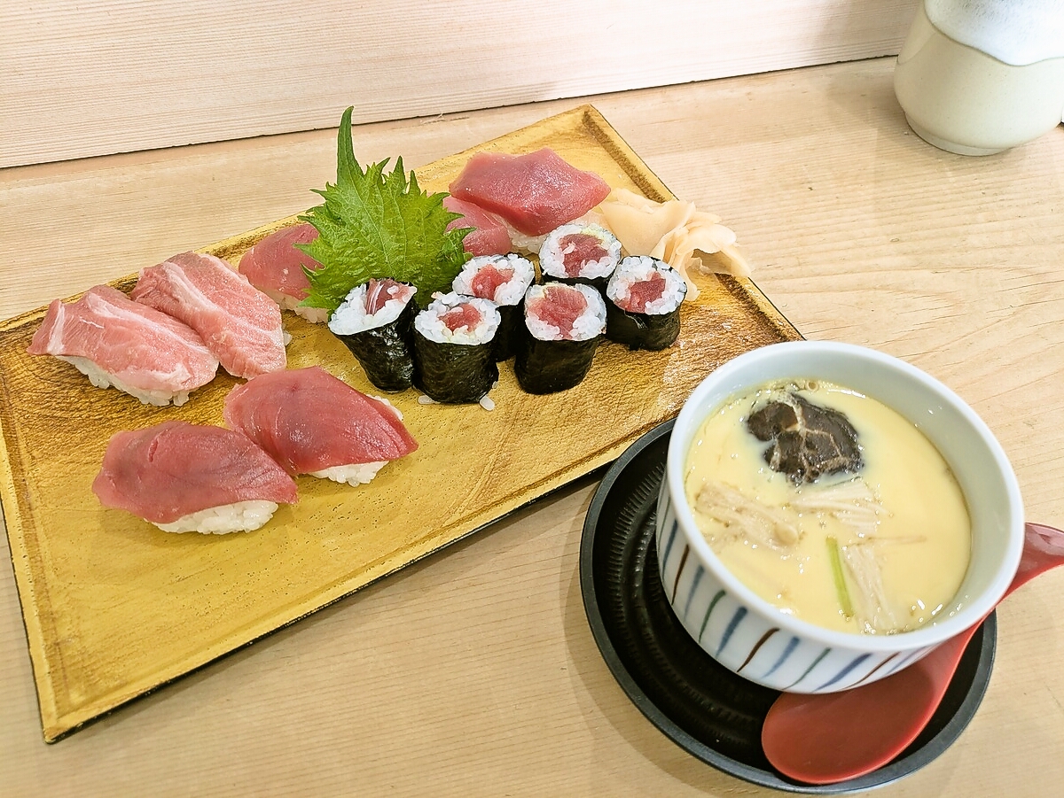 トロのとろける甘み、赤身の深い旨み、鉄火巻の安定感、そして茶碗蒸しとコーヒーゼリーの優しいつなぎ派手さはないが、丁寧な仕事と素材の良さがしっかり伝わる、老舗らしい満足度の高いセットだ
