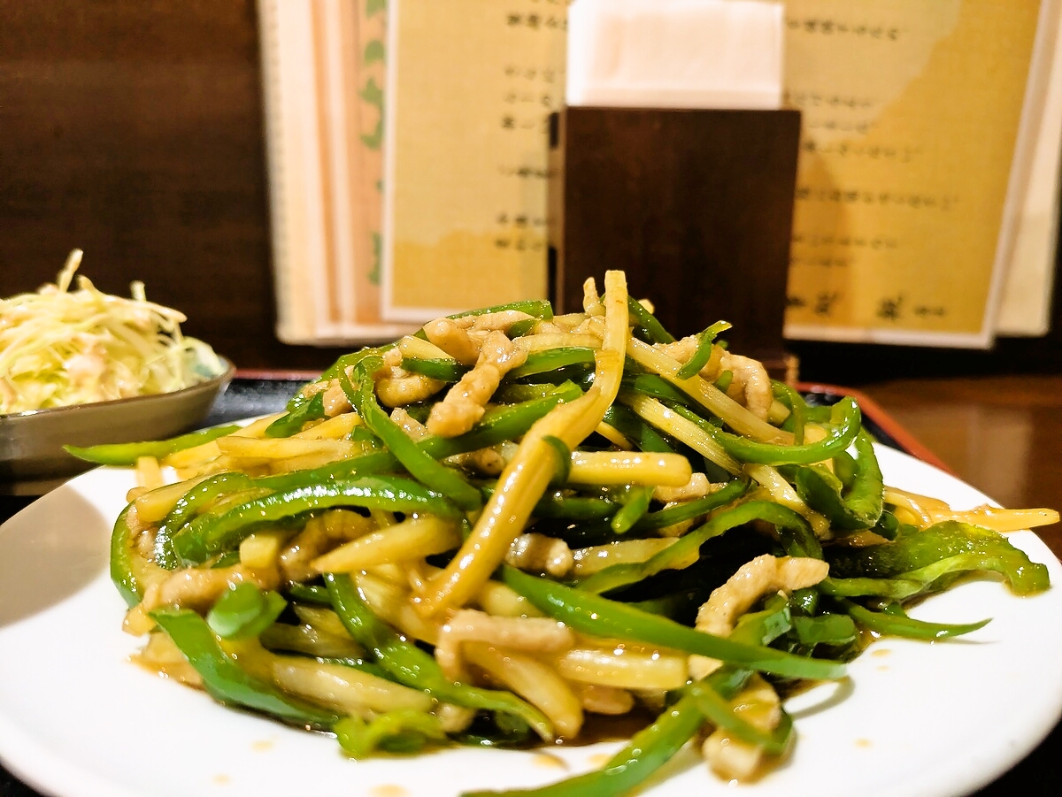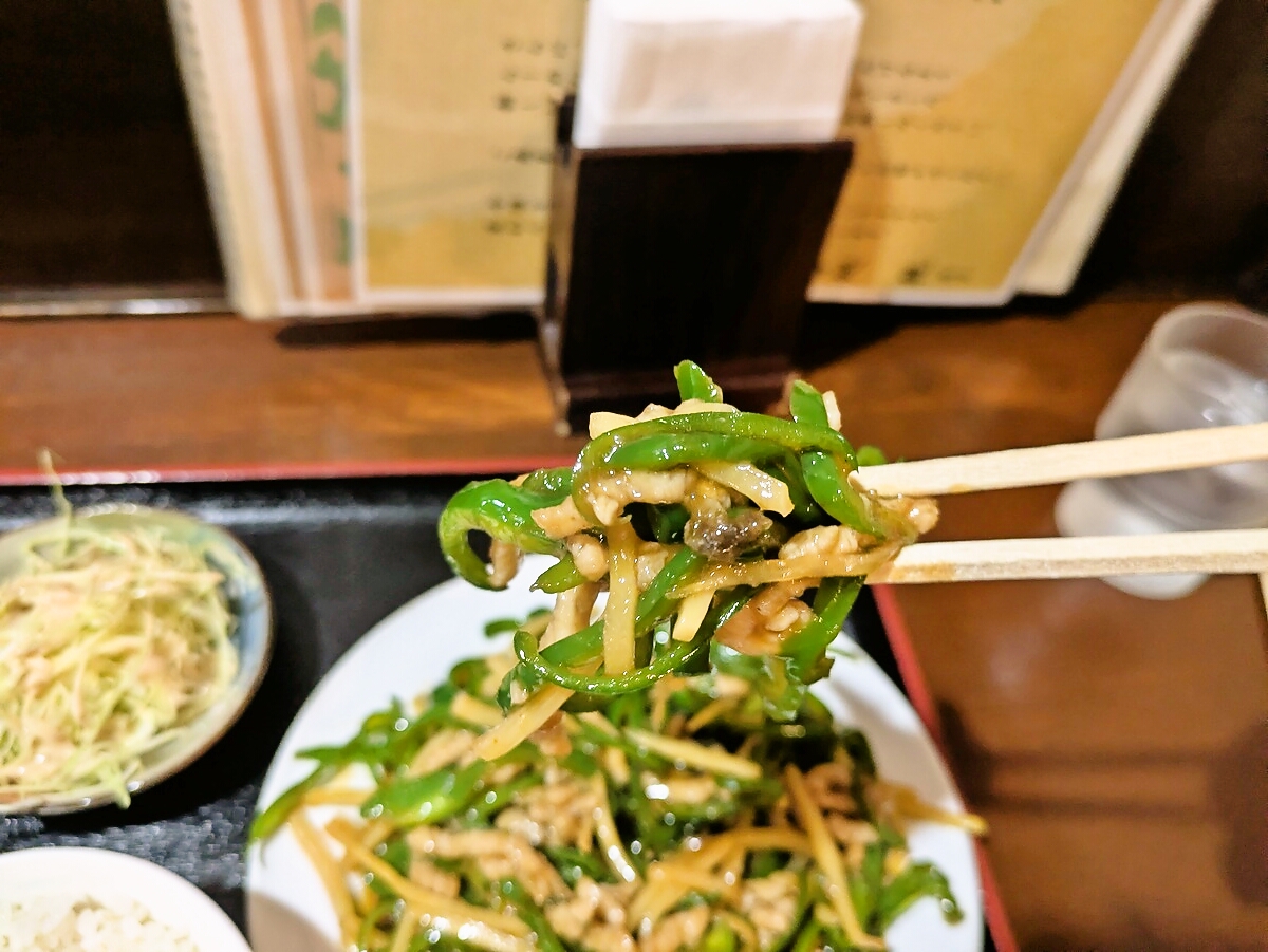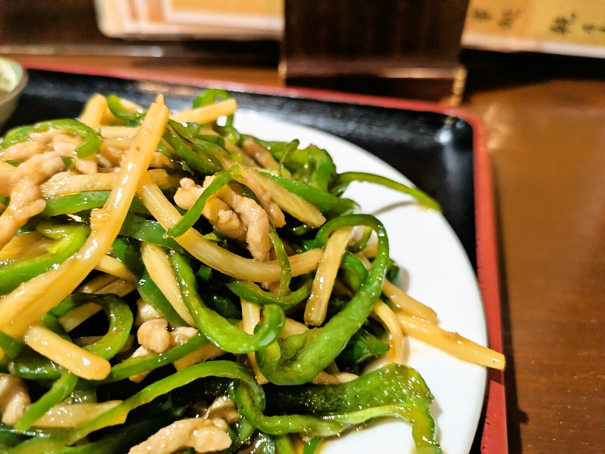 細切りのピーマンとタケノコ、そして豚肉が、強すぎない火入れでシャキッとした歯ざわりを残したまま炒め上げられている