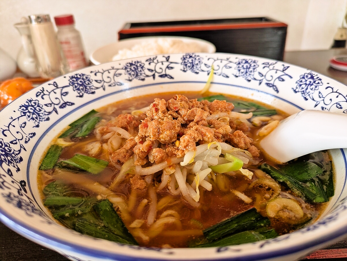 赤みがかったピリ辛スープに、たっぷりの挽肉が山盛り