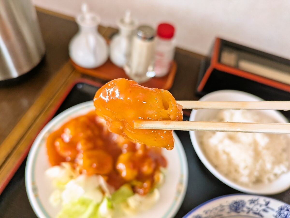 オレンジ色の甘辛チリソースがたっぷり絡み、レタスとの相性も抜群