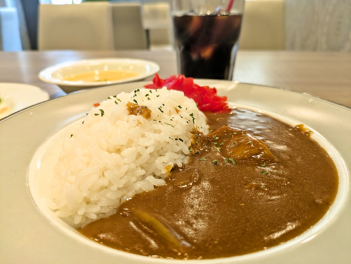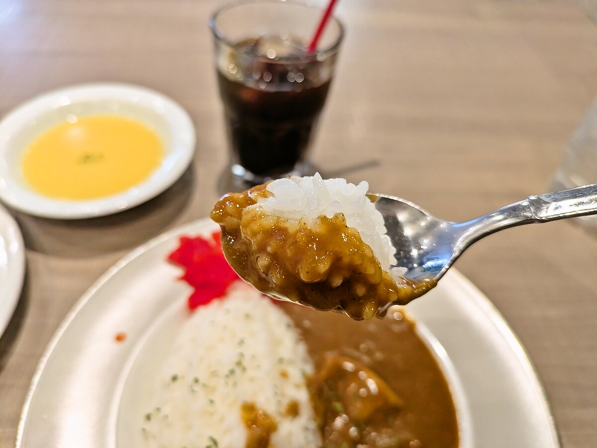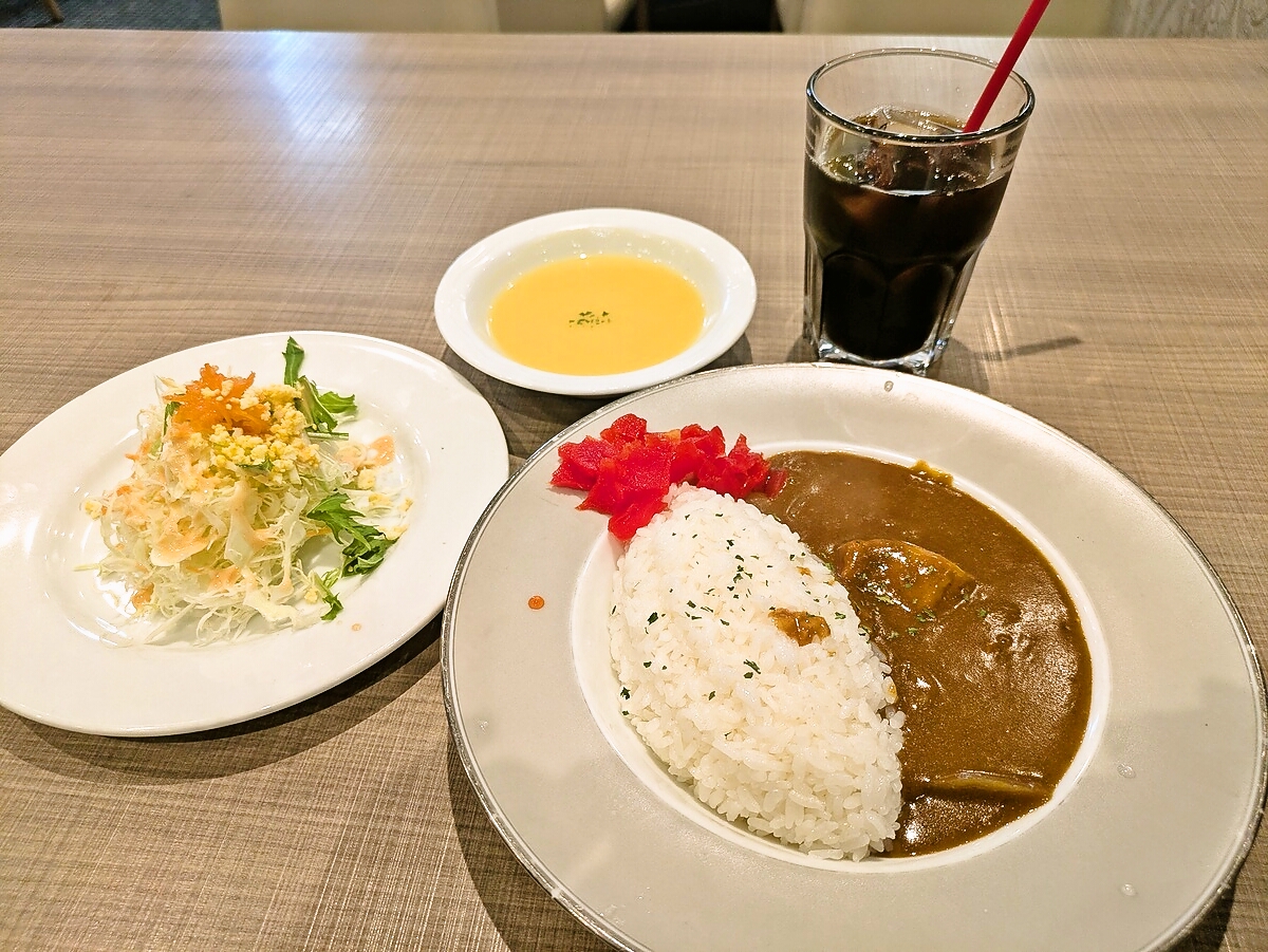大きめビーフの贅沢感、中辛のバランス、そしてサラダ・スープ・アイスコーヒーまで揃った満足度の高さが魅力的だ