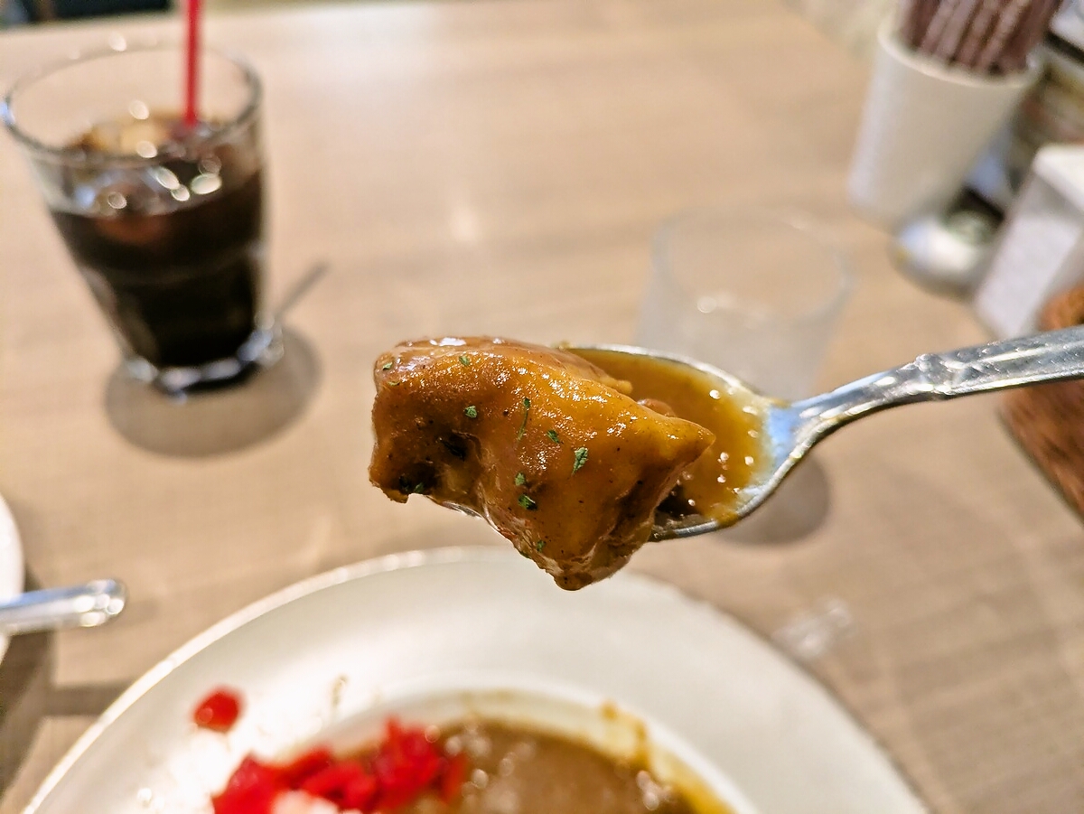 スプーンで簡単にほぐれるほど柔らかく煮込まれており、噛むたびに肉の旨味が口いっぱいに広がる