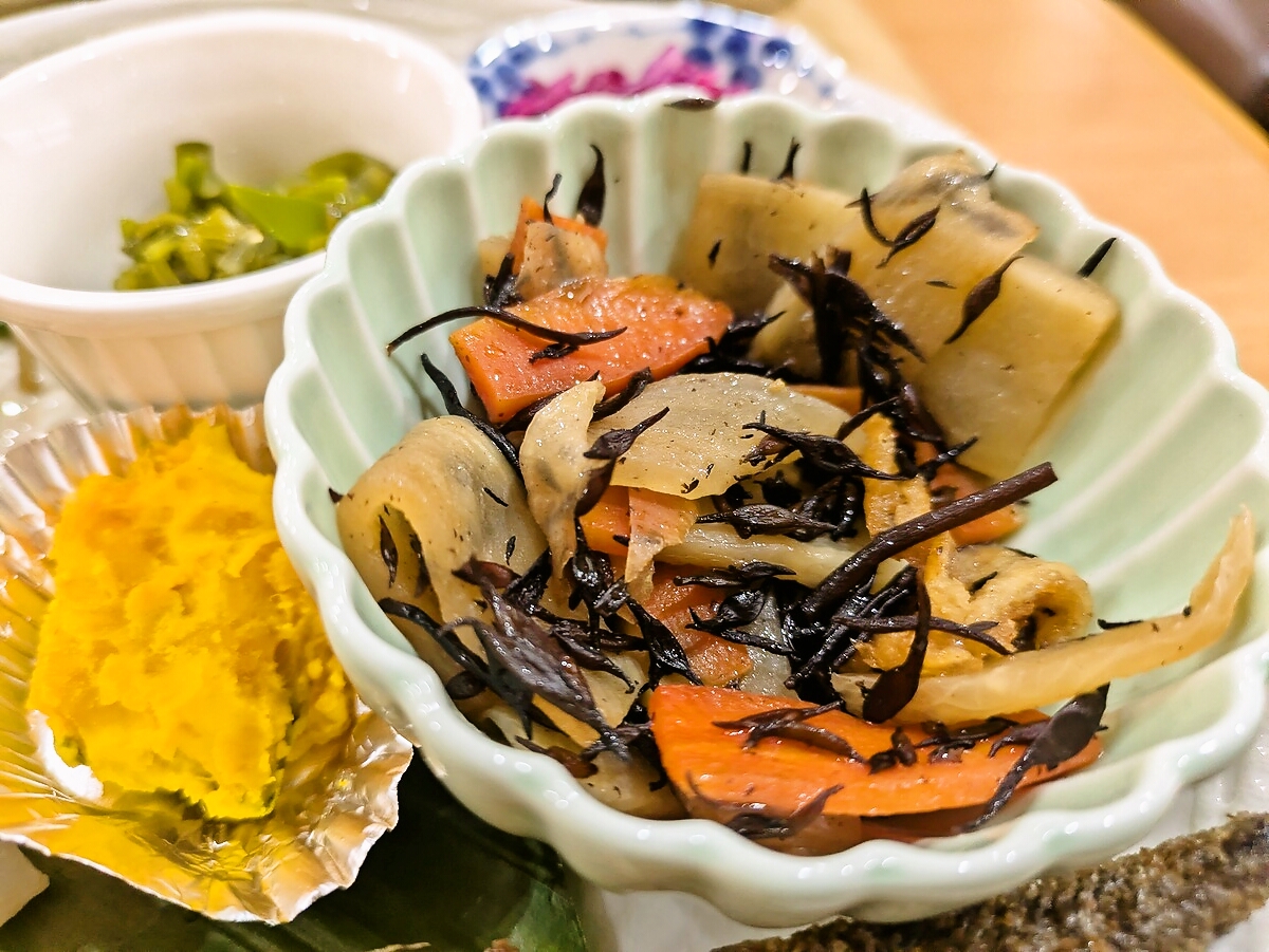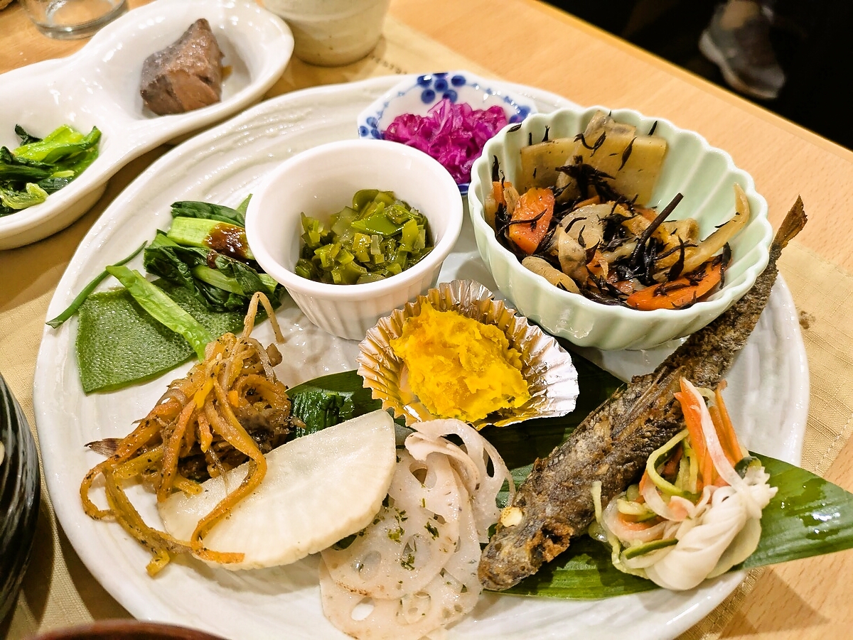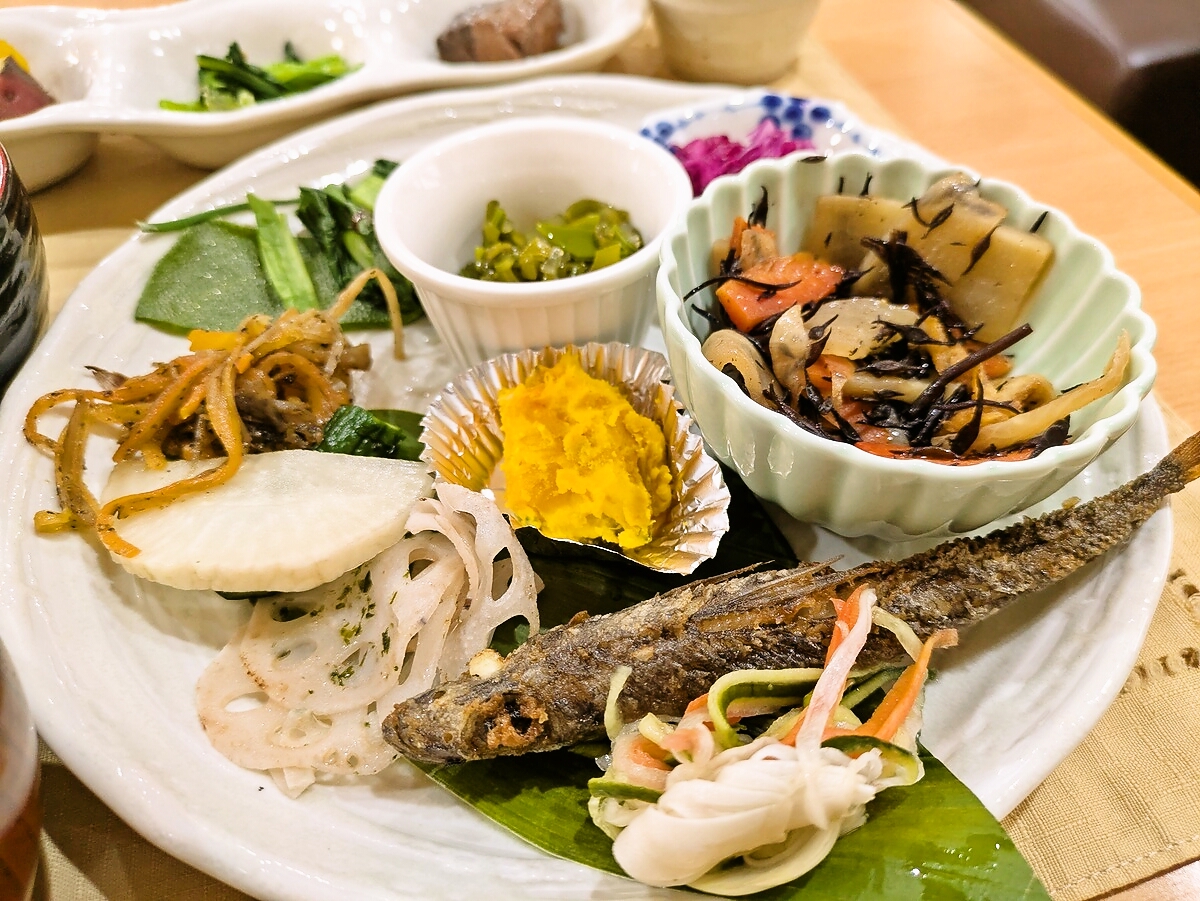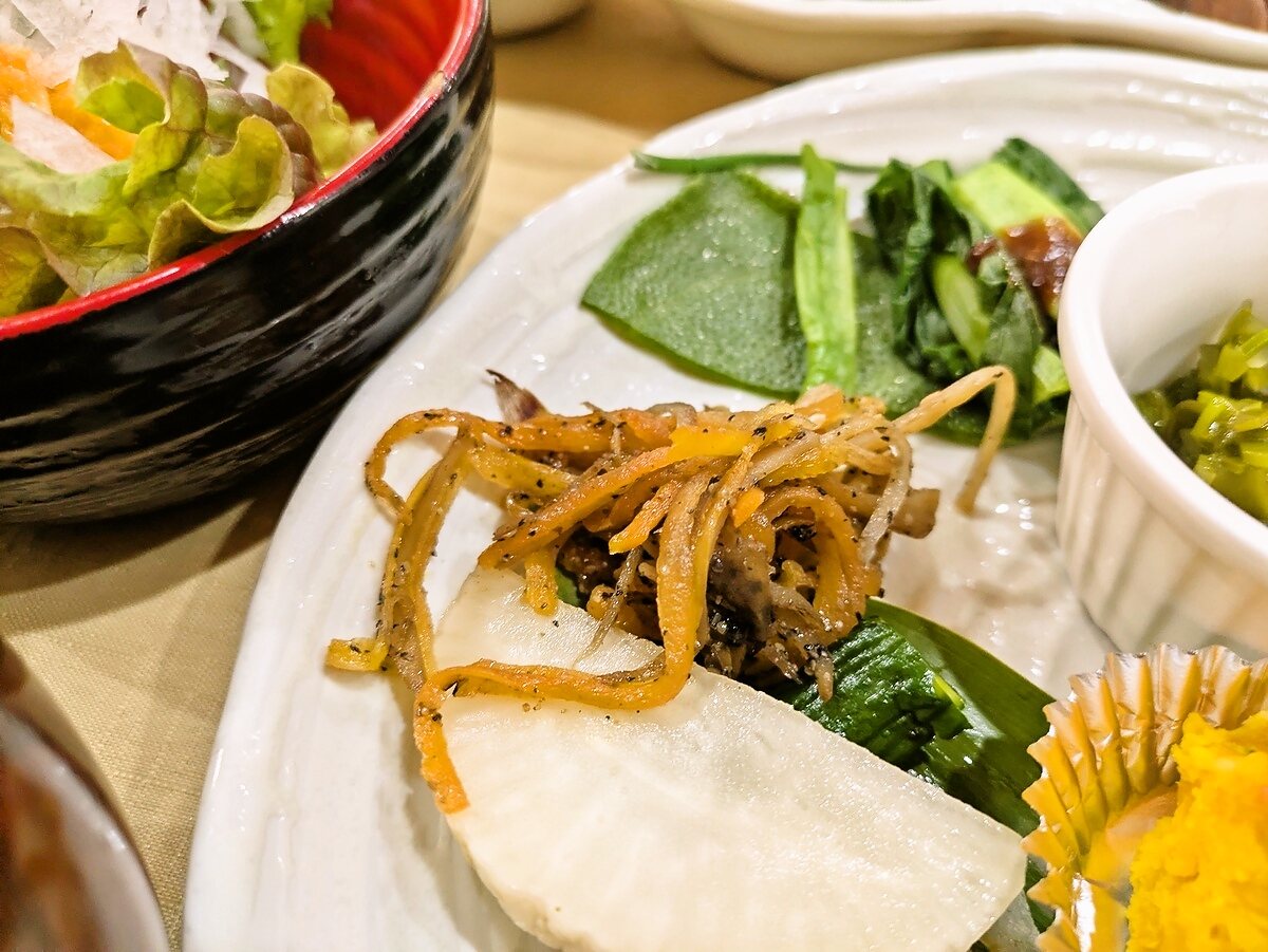 れんこんの酢漬け、にんじんの煮物、ひじき煮、かぼちゃの煮物、紫キャベツの浅漬け、きのこの炒め物など…野菜それぞれに異なる調理法で、食感と味わいのコントラストが楽しい
