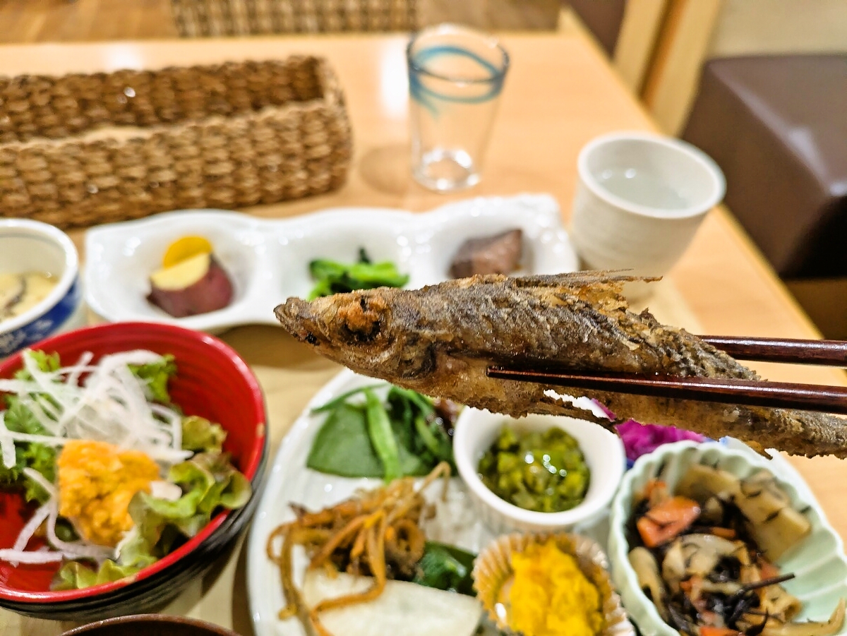 メヒカリは頭から尻尾までパリッと焼き上げられ、苦味と旨味のバランスが絶妙