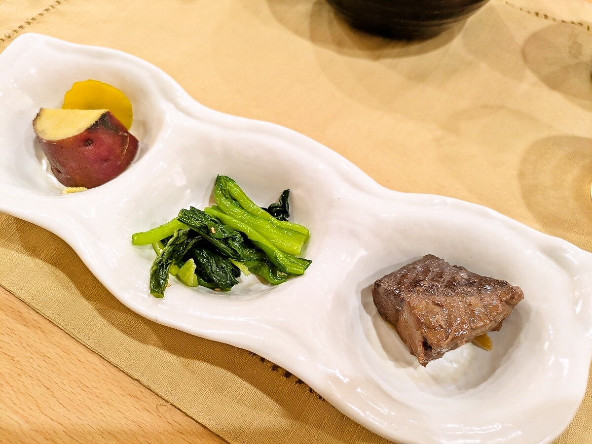 白い三つ仕切り皿で登場した小鉢三種