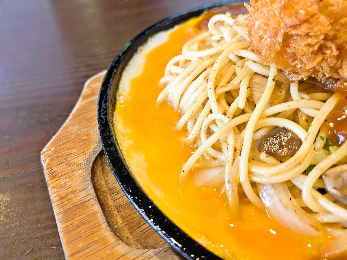 スパゲティの周りをぐるりと囲むように流し込まれ、鉄板の熱でゆっくり固まりながら、香ばしい縁をつくっていく