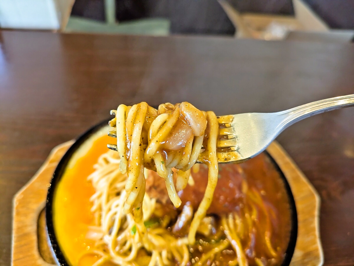 太めでモチッとした麺が鉄板の熱で香ばしく焼け、ところどころに“おこげ”のような風味が生まれる