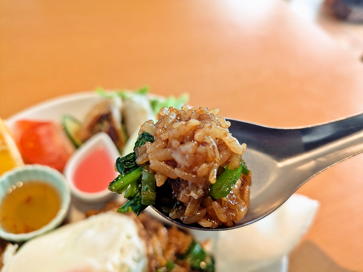 ケチャップマニスがしっかり染み込んだ茶色いごはんは、にんにく・エシャロット・唐辛子が香ばしい