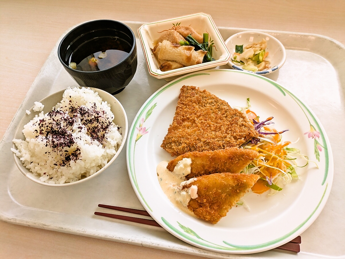 自主配膳の日替わりランチ「アジフライと白身魚のフライ(700円)」
