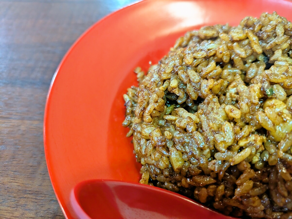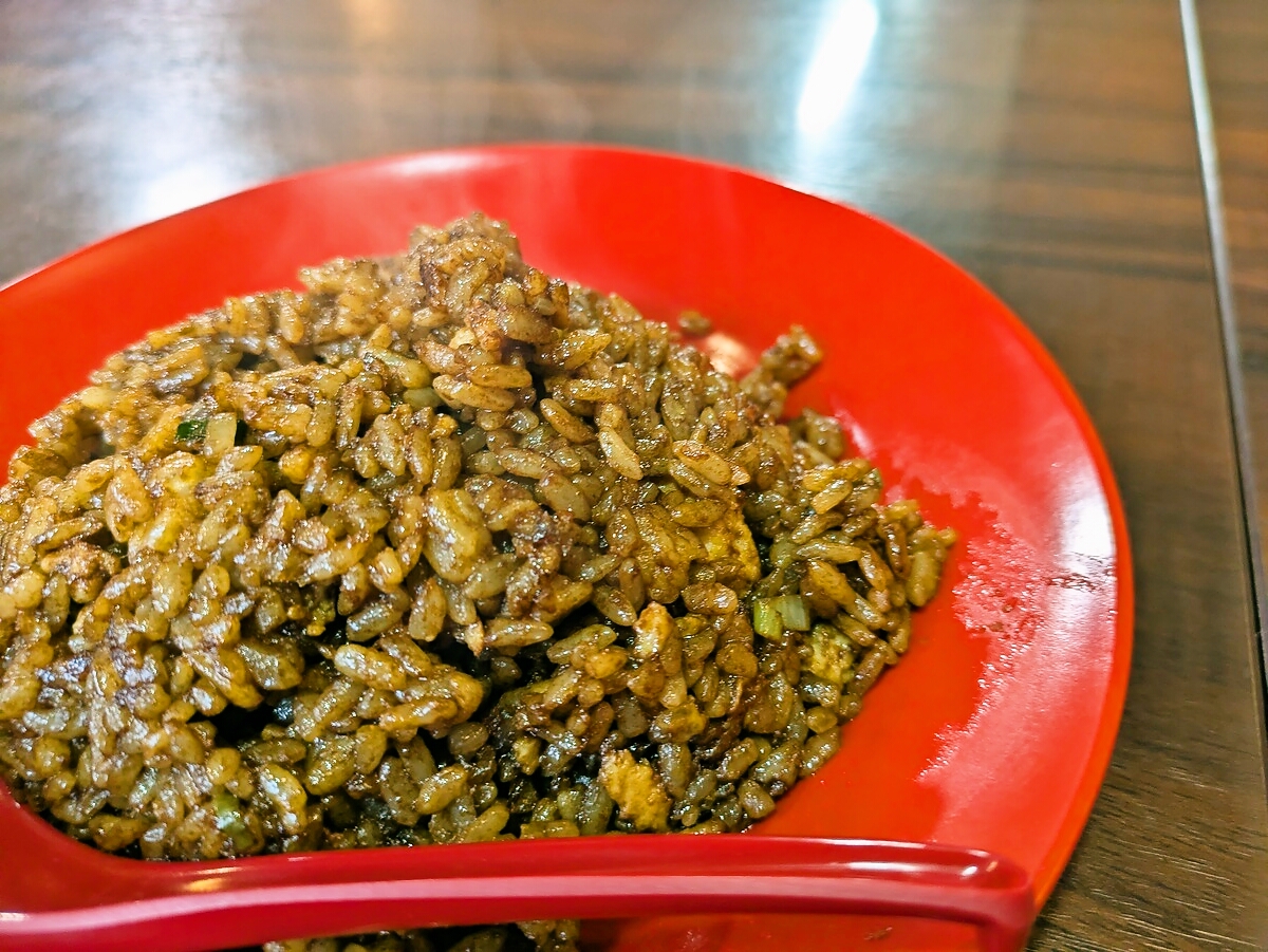 老抽王(中国の濃口醤油)で仕上げられた炒飯は、まるで黒曜石のような深い色合いで、視覚的にはかなりパンチがある