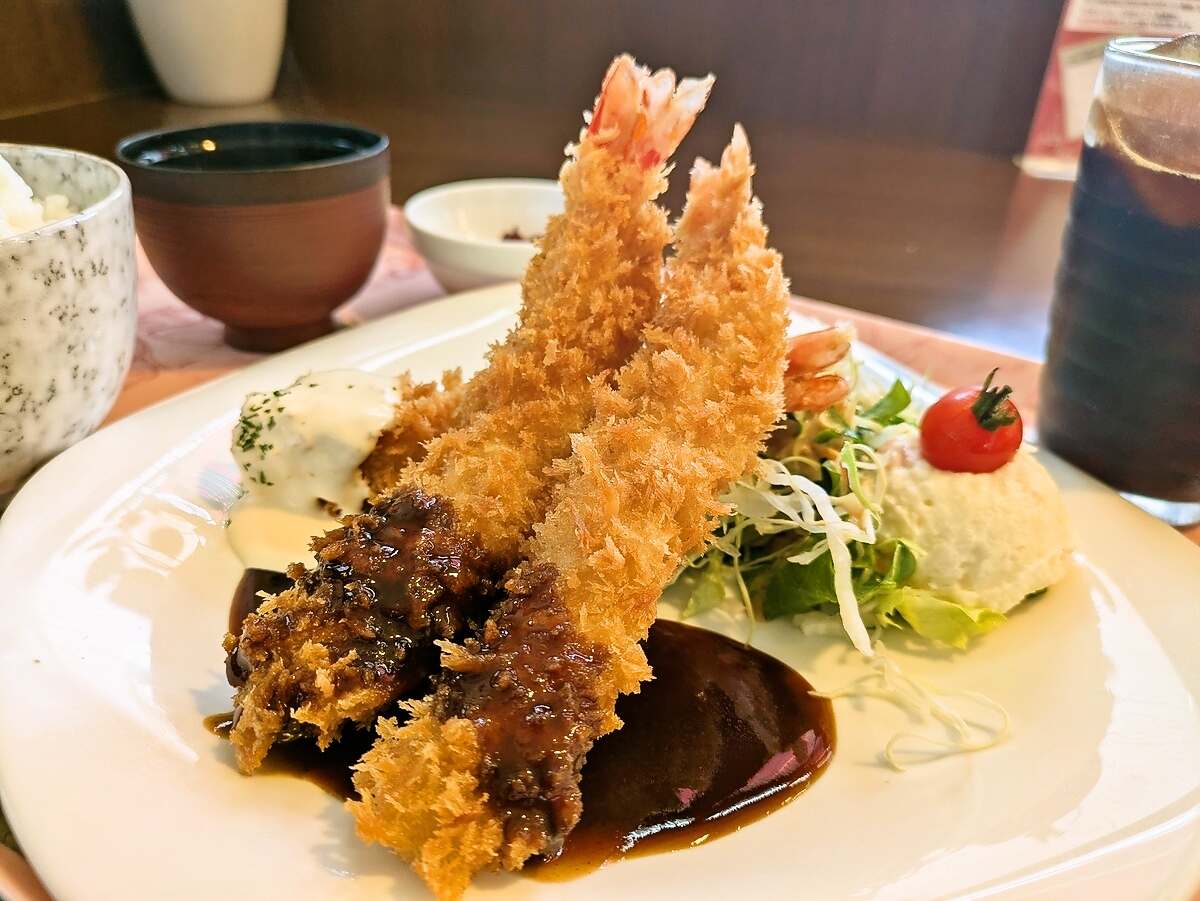 皿の中央に堂々と並ぶ大ぶりの海老フライ3尾に目を奪われる