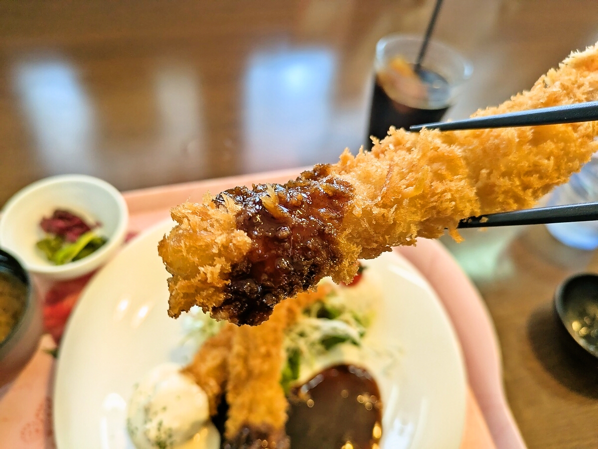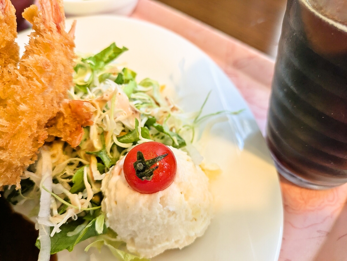 付け合わせにシャキシャキのサラダとポテトサラダが添えられており、揚げ物の合間に嬉しいアクセントになっている