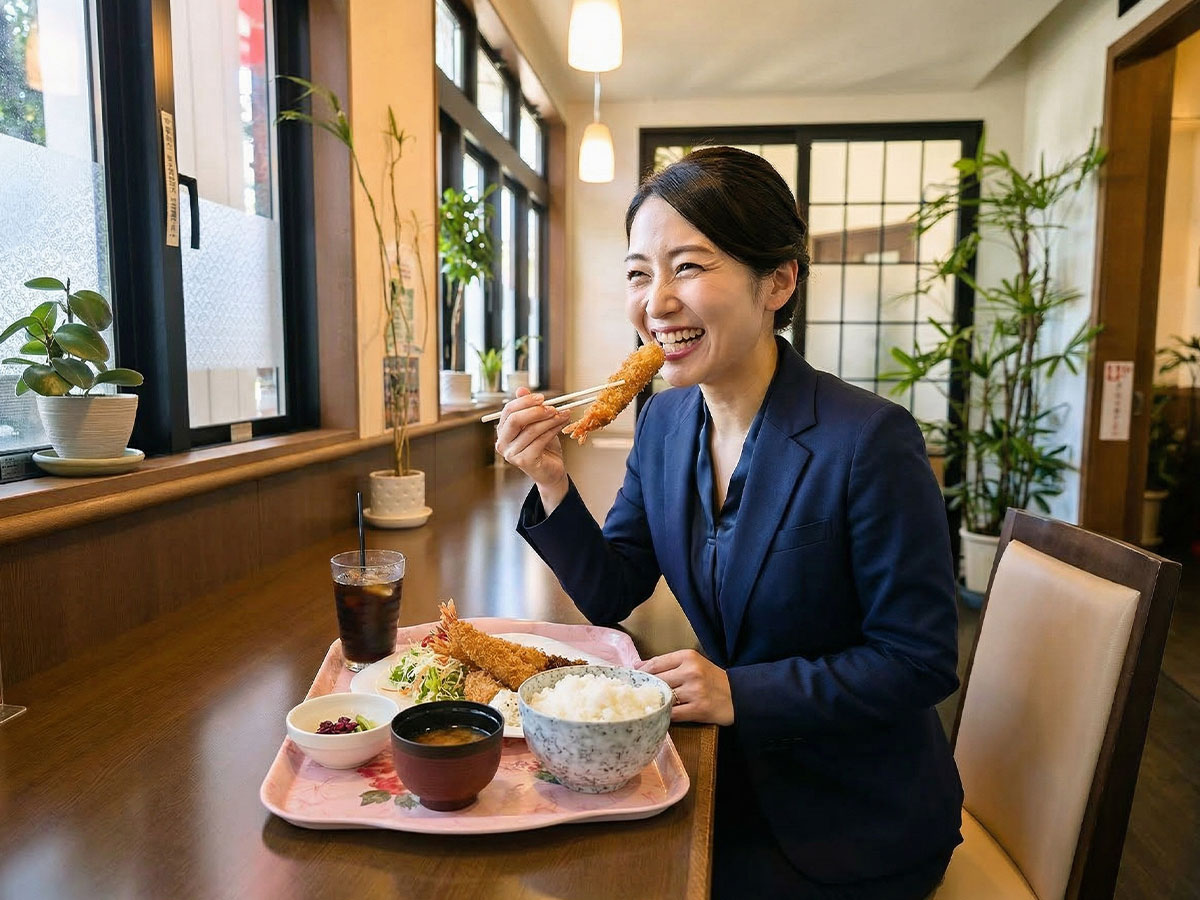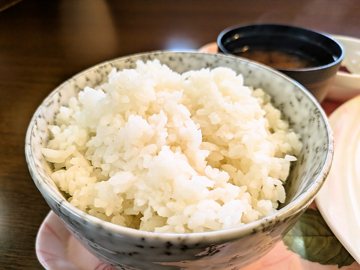 大きめの茶碗にこんもりと盛られた真っ白なごはんは、海老フライの力強い旨味を受け止めるのに最高の相棒