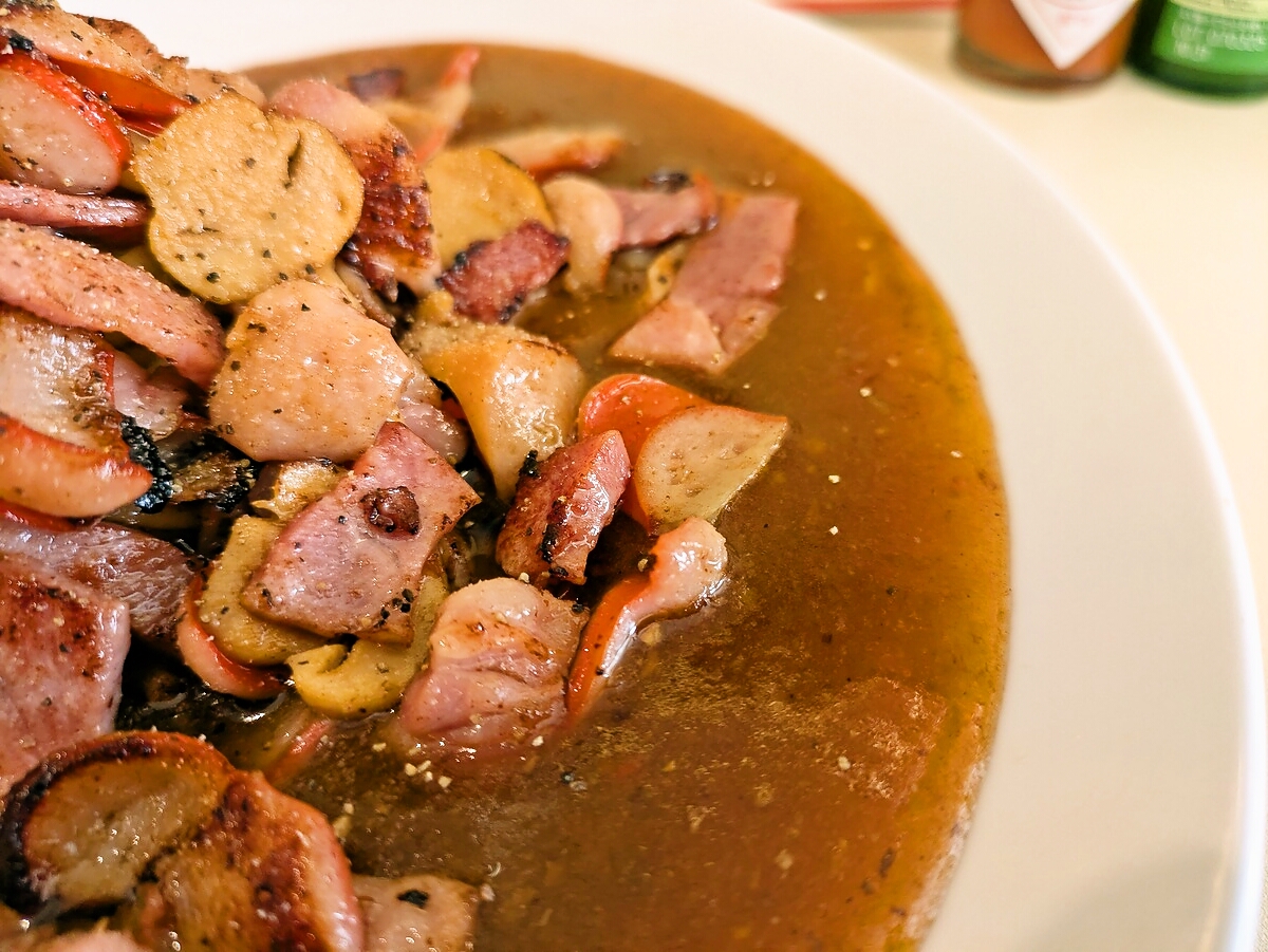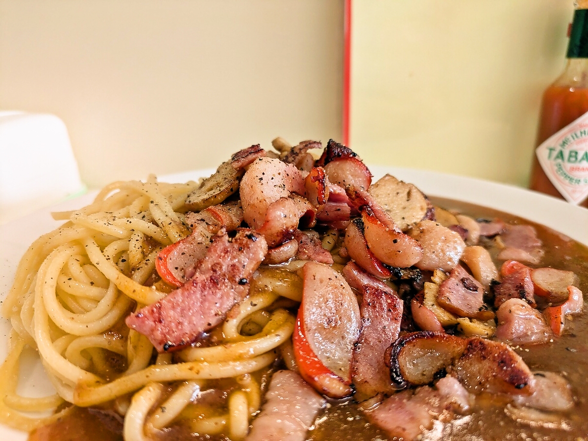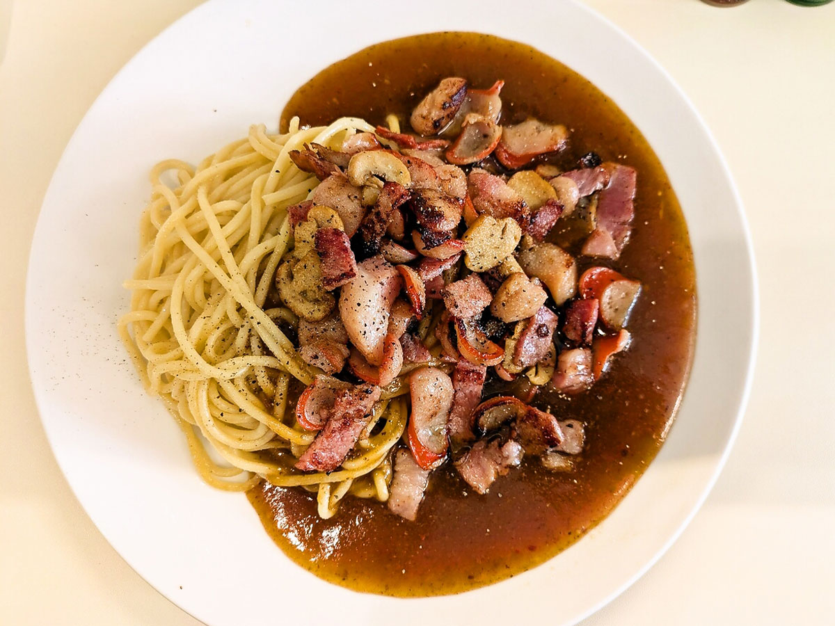 赤ウィンナーのプリッとした食感と甘み、ベーコンの塩気と脂のコク、マッシュルームの旨みがソースと混ざり合い、食べ進めるほどに味の層が深くなる