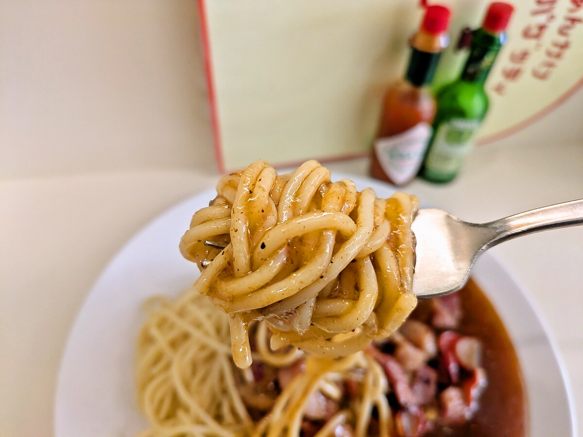 フォークを入れると、具材がゴロゴロと転がるほど量が多く、ひと口目から“具材と麺を一緒に食べる喜び”がしっかり味わえる
