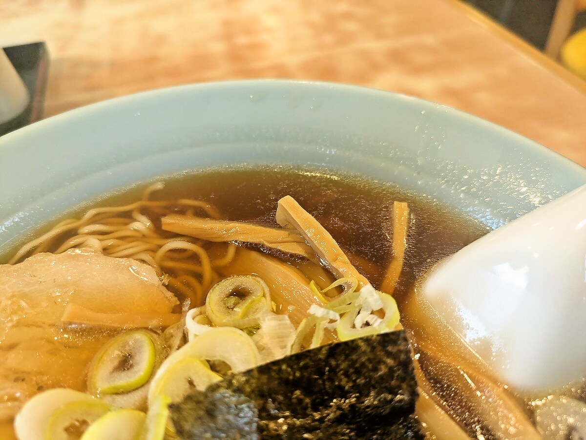 透明感のある琥珀色のスープは、鶏ガラと野菜を丁寧に煮出したような、角のない優しい旨み