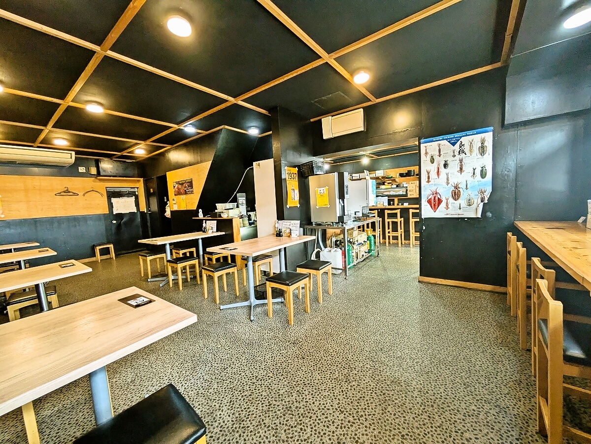 店内は木の梁が天井に走る開放的な空間で、増築・リニューアルされた広々とした作り