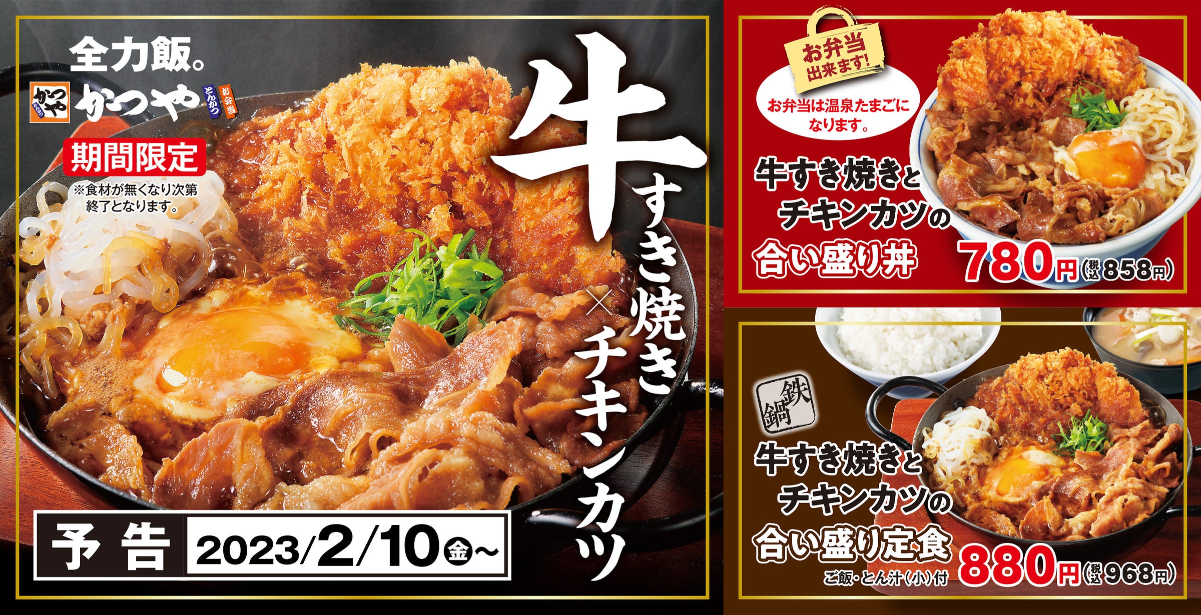 とんかつ専門店「かつや」に、冬に食べたい肉鍋料理の代名詞である牛すき焼きをチキンカツと合い盛りにした「牛すき焼きとチキンカツの合い盛り」が5年ぶりに期間限定で登場いたします。